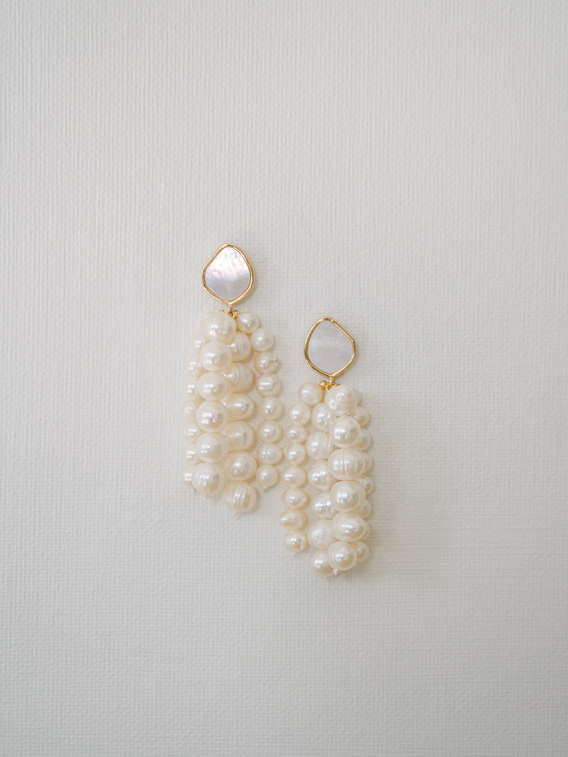Aphrodite exudes divine elegance, featuring shimmering mother-of-pearl inlays that anchor cascading strands of luminous freshwater pearls. This bold and breathtaking design evokes the timeless allure of the goddess of love herself, making it the perfect statement piece for the bride who desires romance and grandeur on her special day.