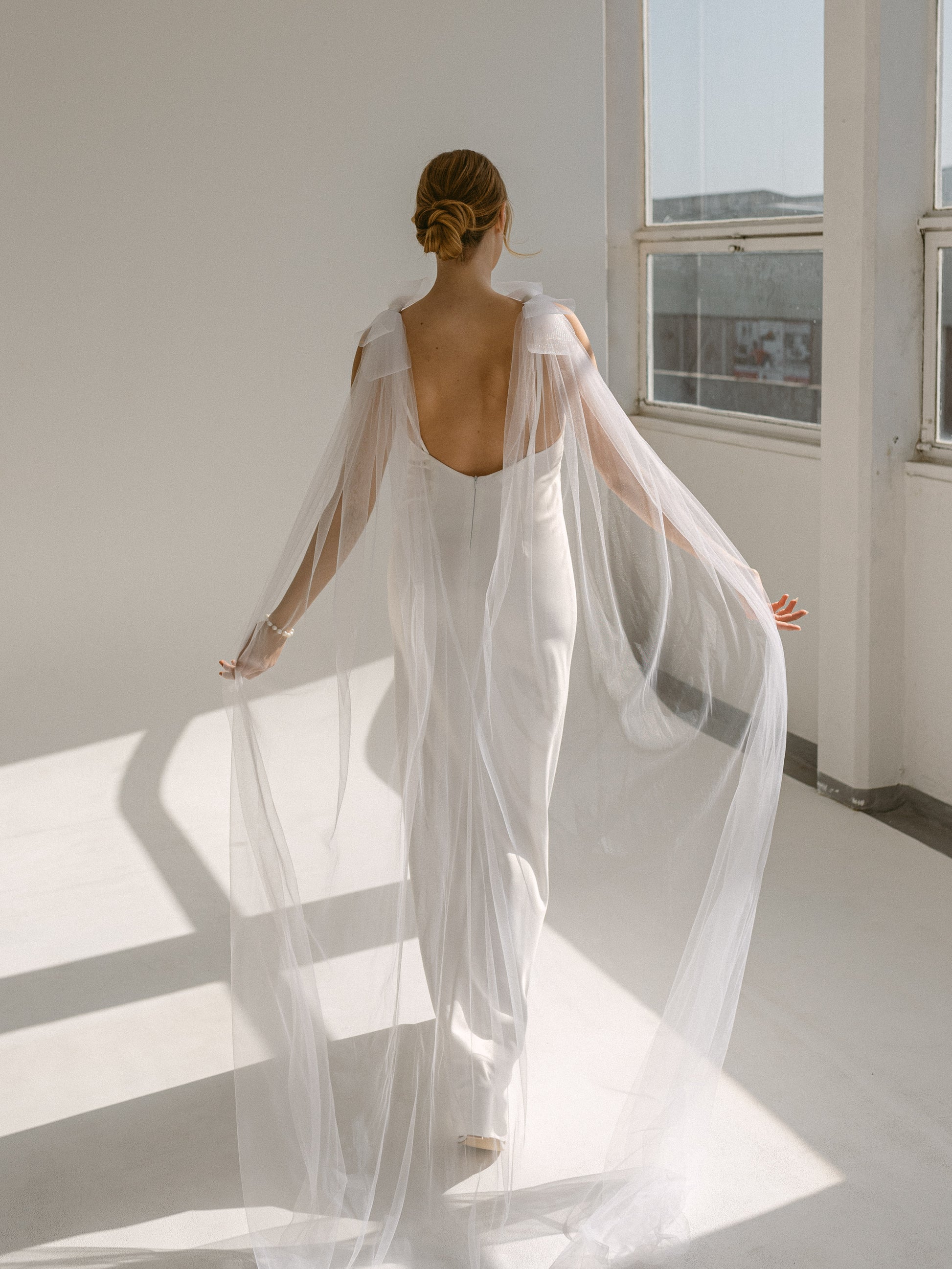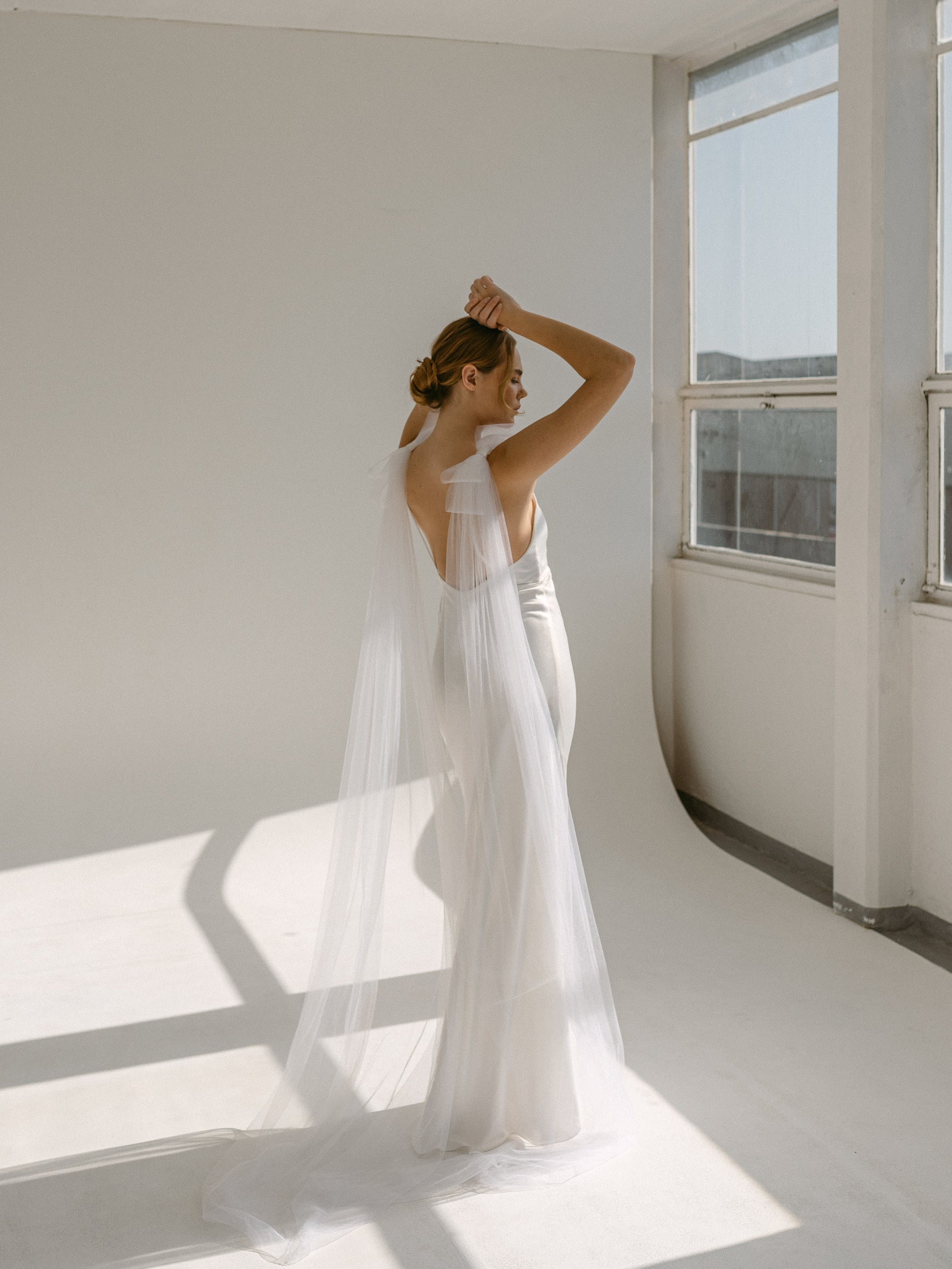 The exquisite Bow Cape Veil is crafted from soft tulle, featuring mesh bows adorning the shoulders. The delicate fabric and bow accents create a stunning silhouette that flows elegantly with every step you take.