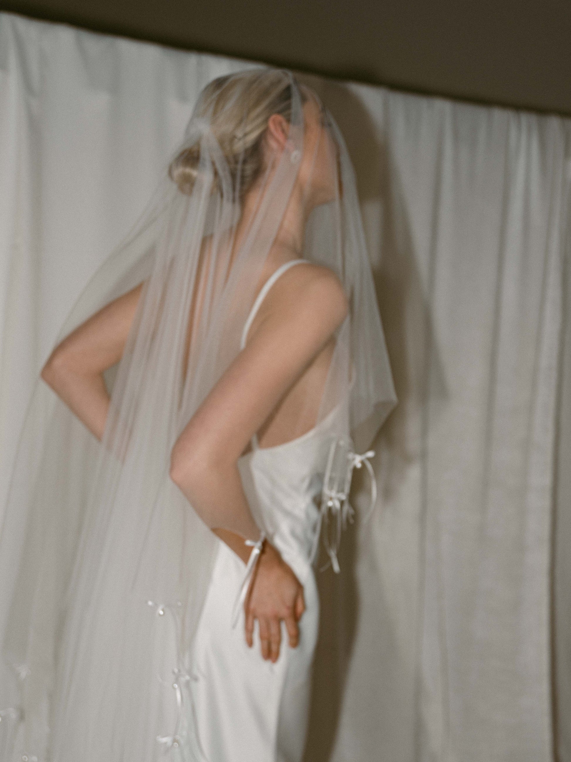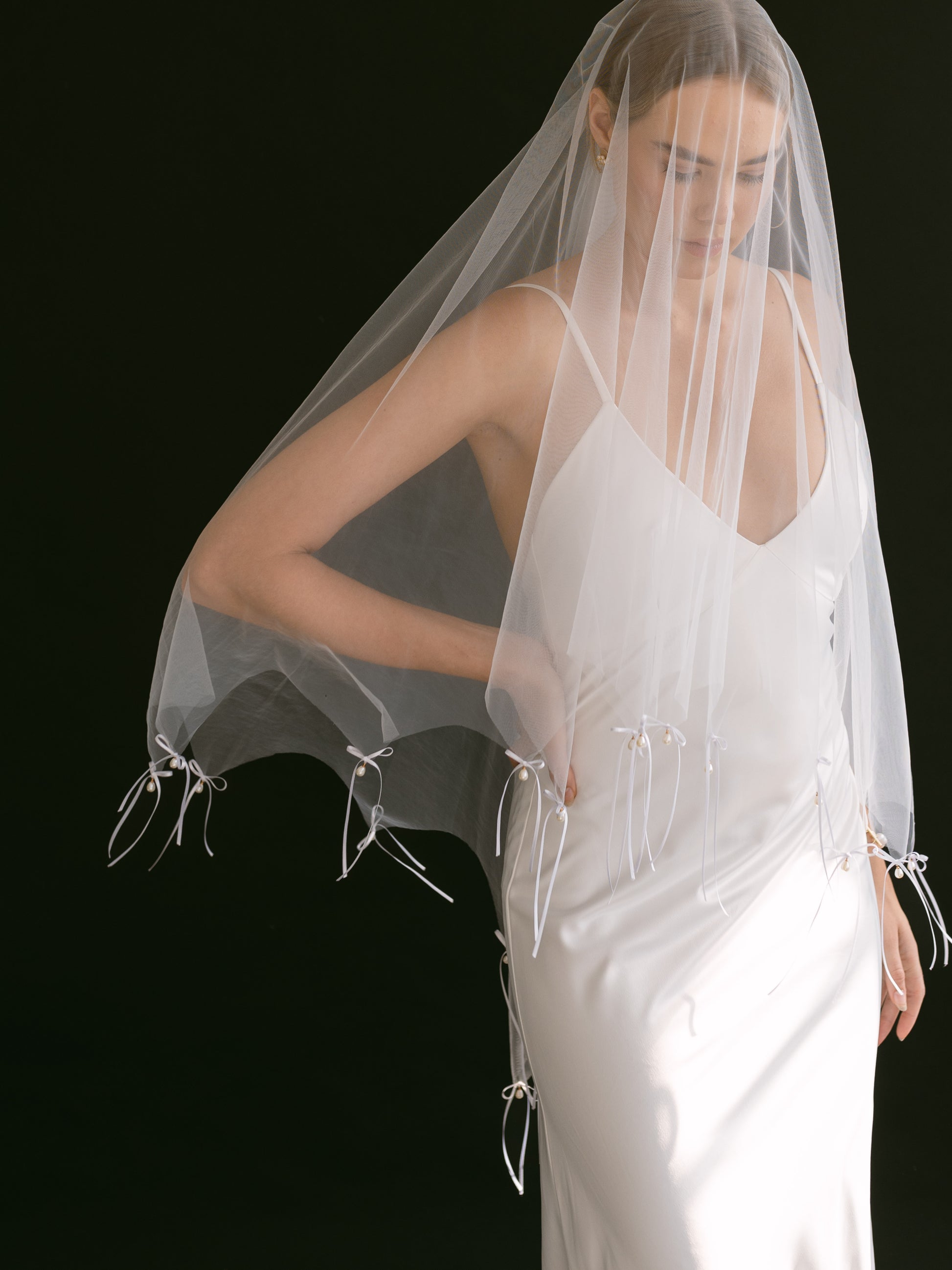 This midi-length veil features delicate drop pearls and subtle bows along a scalloped edge, blending classic elegance with whimsical charm. Perfect for brides seeking a touch of sophistication with a playful twist for their special day.