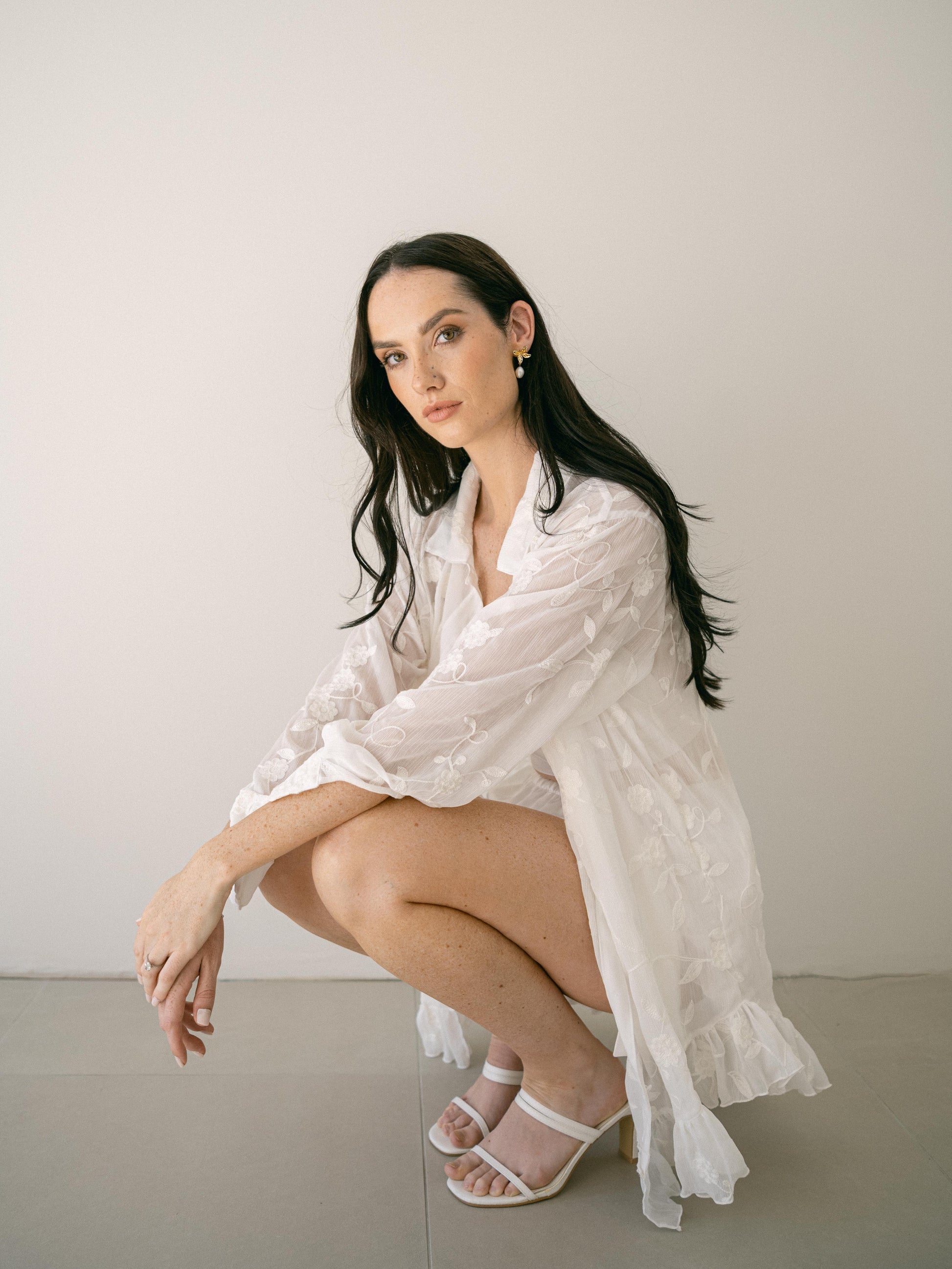 A romantic take on a classic. Designed with a soft collar, cuffed sleeves, and delicate ruffle trim, this sheer embroidered shirt adds elegance to your bridal moments—perfect for getting ready or unwinding in style.