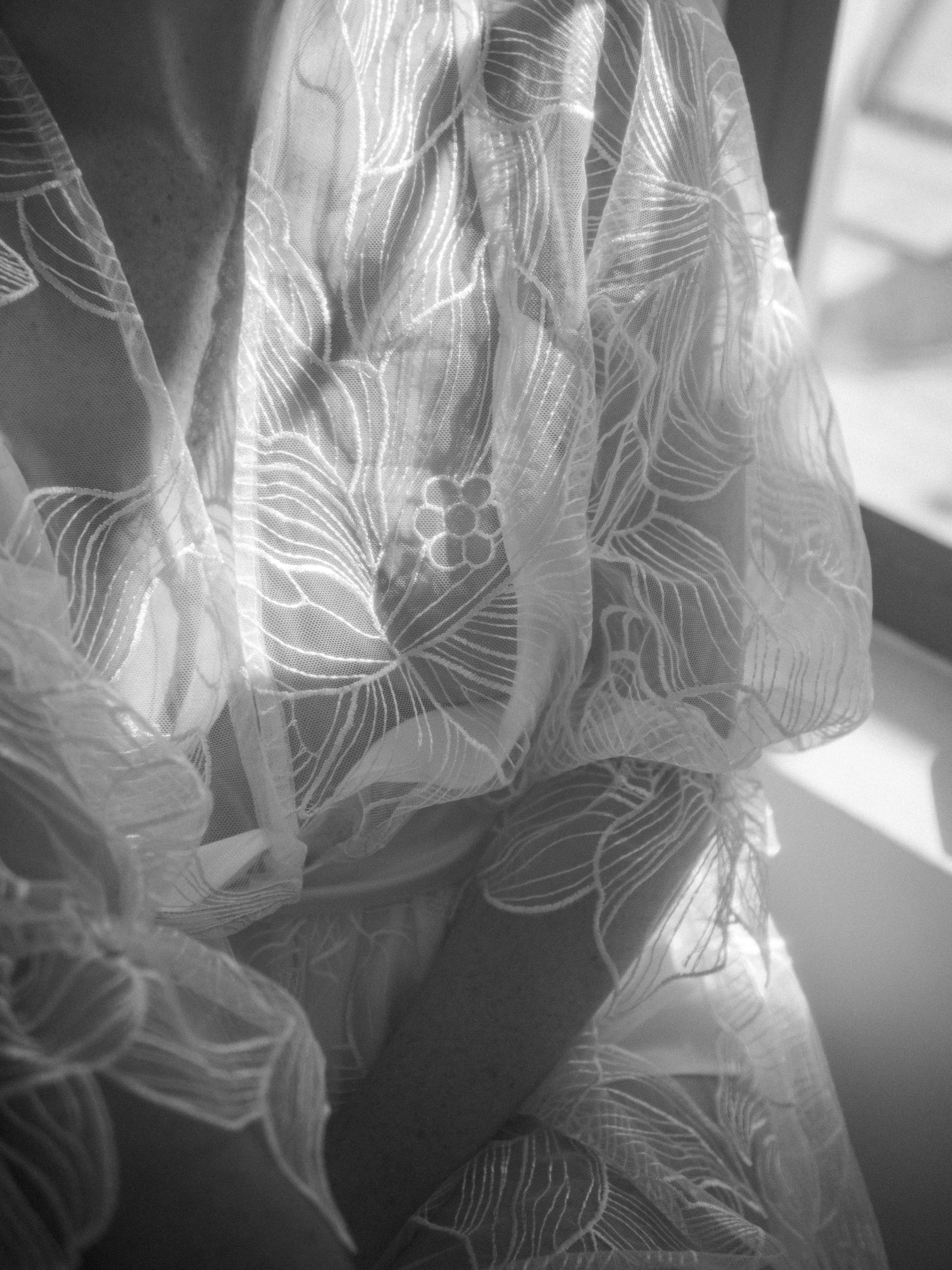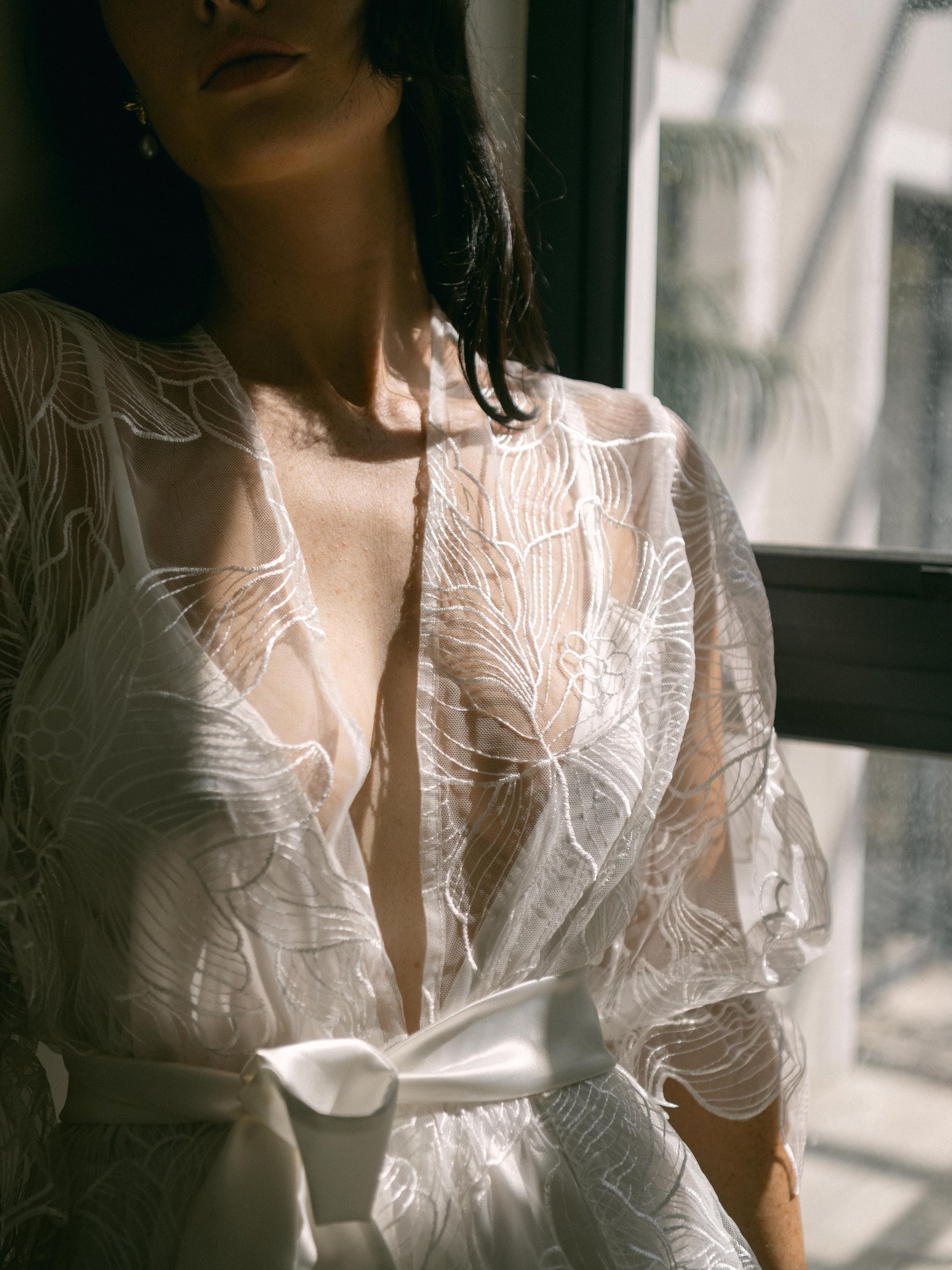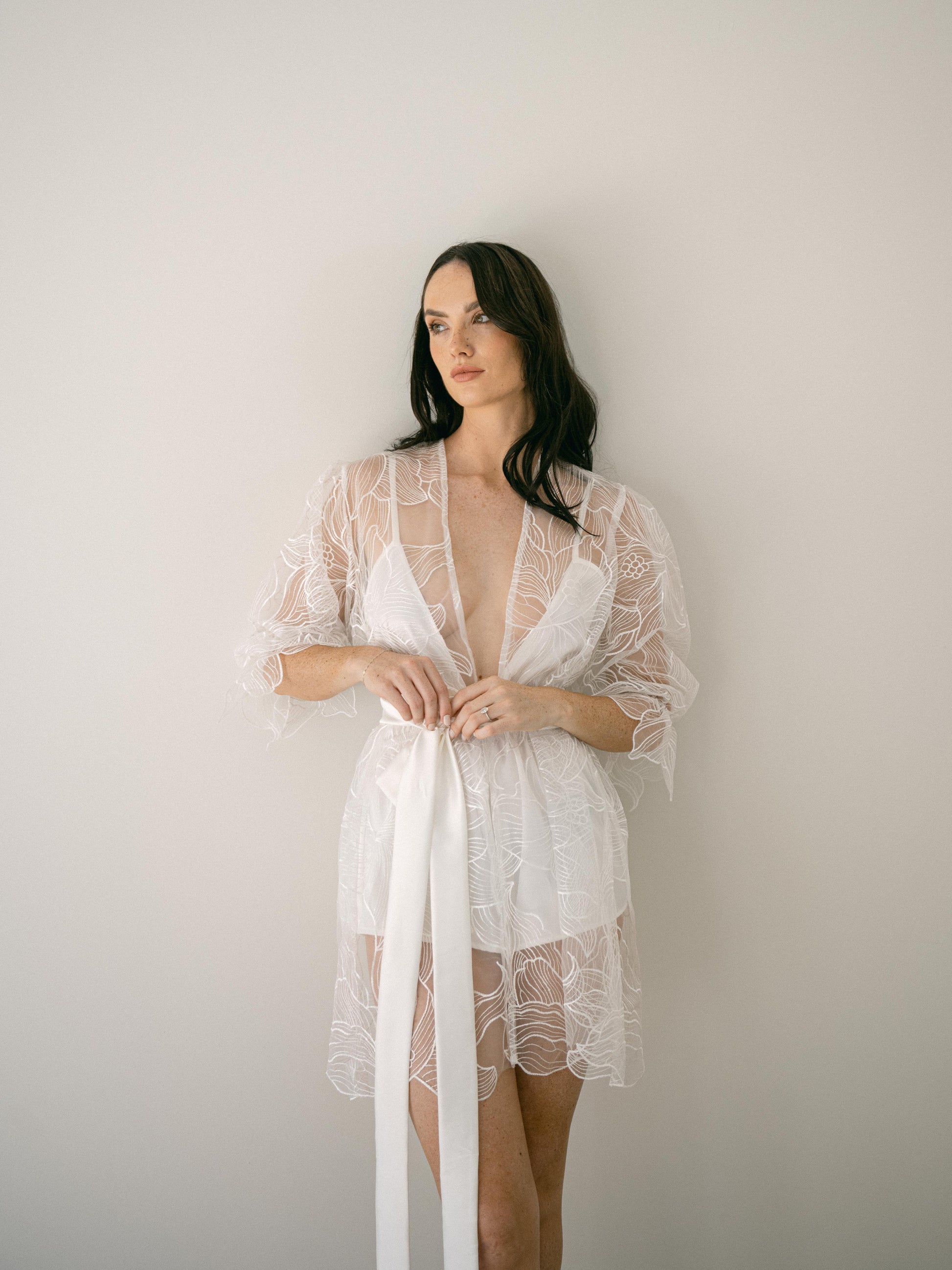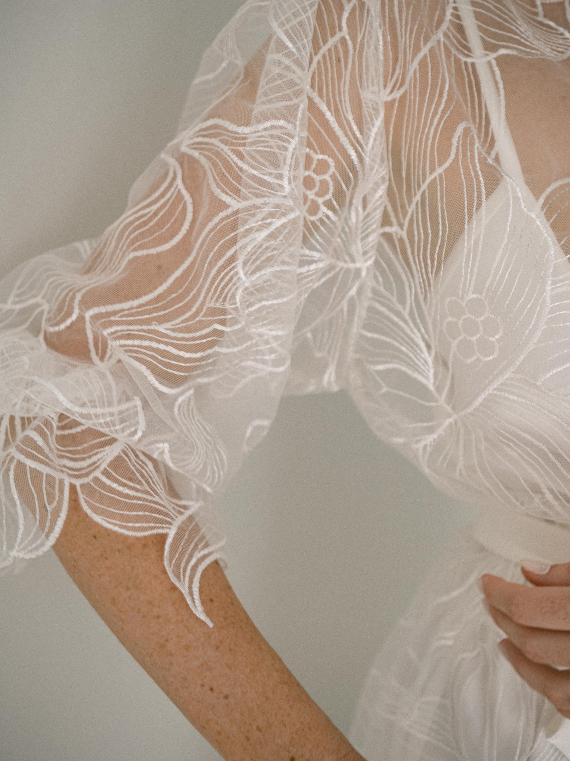 Wildflower short robe is a sheer embroidered tulle robe with delicate floral motifs and elegant cut-out details on the sleeves and hem. Light, feminine, and romantic—perfect for the bride’s getting ready moments.