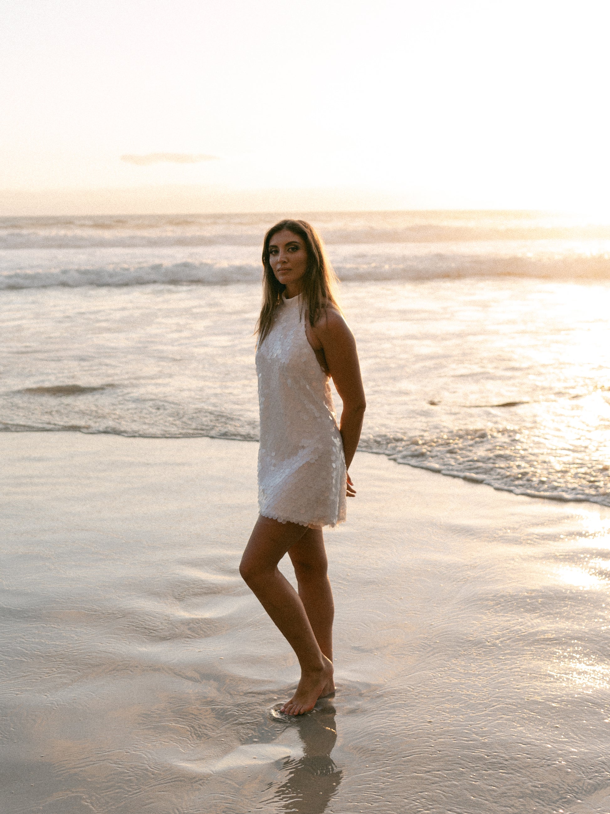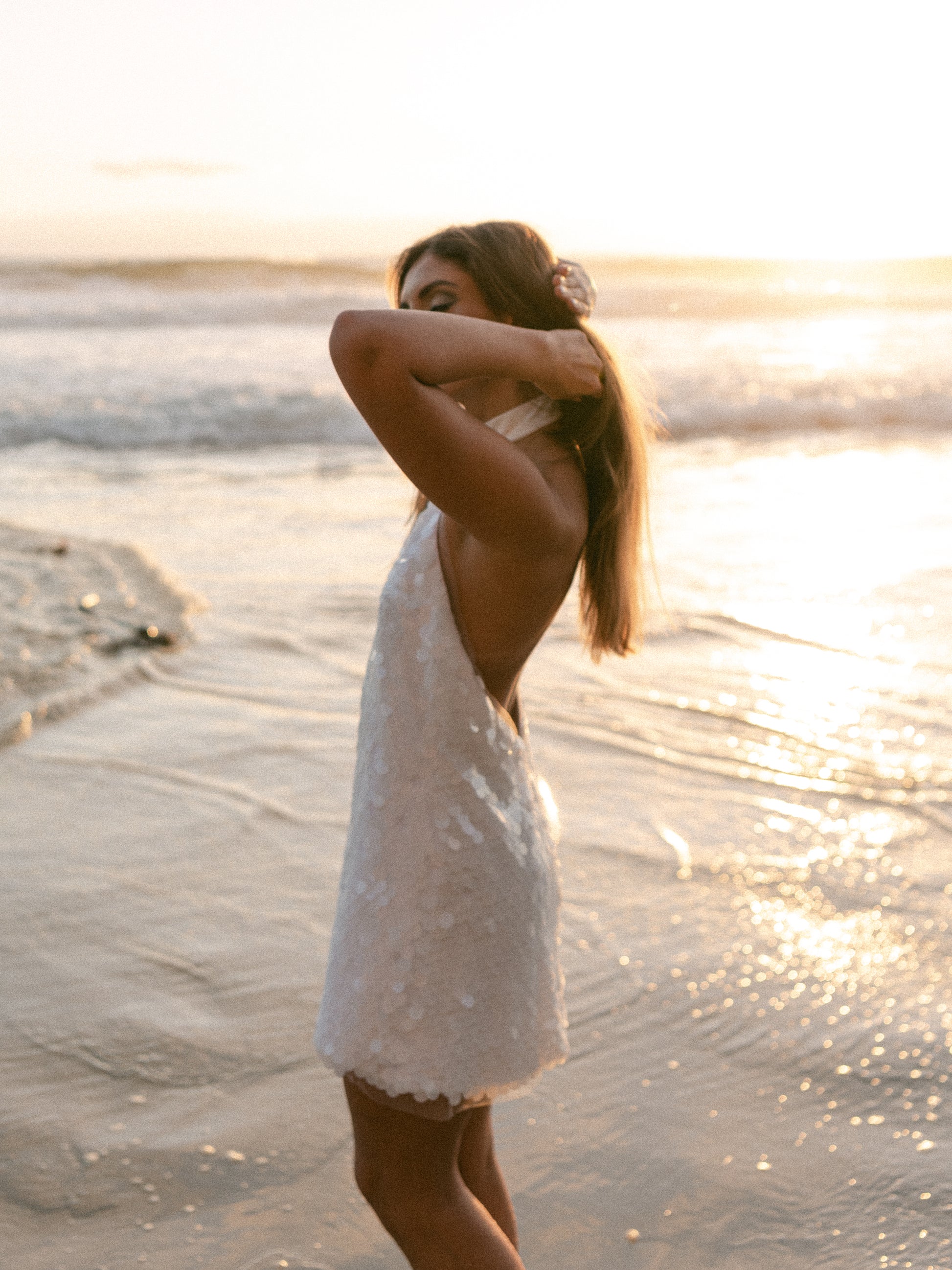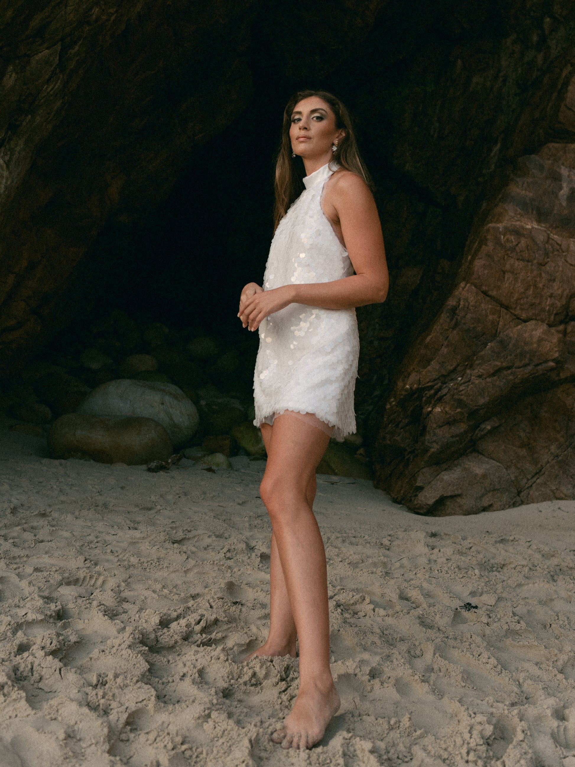 Lyra - ultimate statement for the modern party bride—bold, luminous, and effortlessly chic. Designed with oversized sequins that catch every flicker of light, this halter neck mini dress exudes celestial glamour. A delicate tulle trim softens the shimmer, adding a touch of ethereal romance to its daring silhouette. Made for the bride who isn’t afraid to dance the night away, Lyra is the perfect fusion of modern elegance and goddess-like radiance.