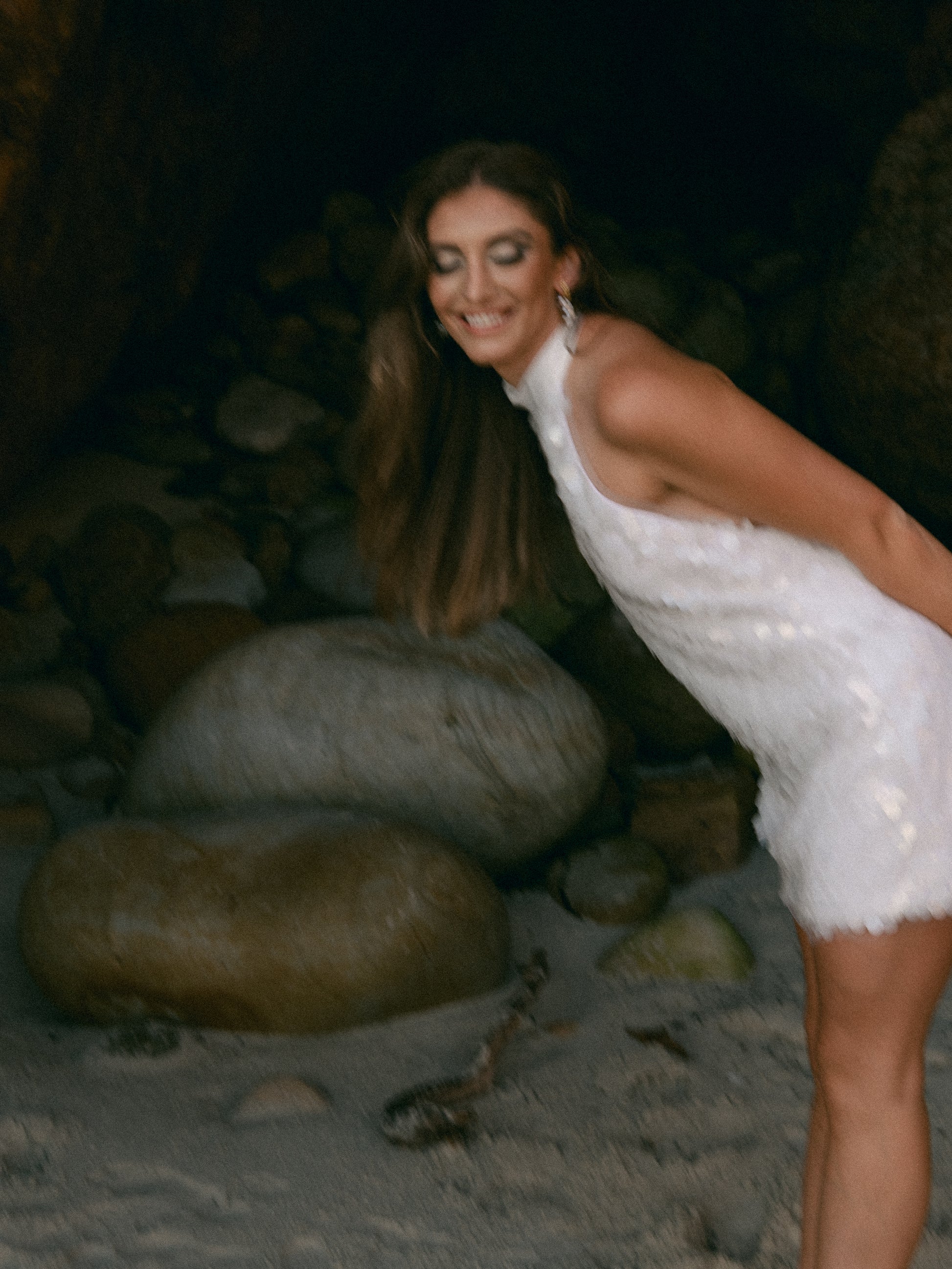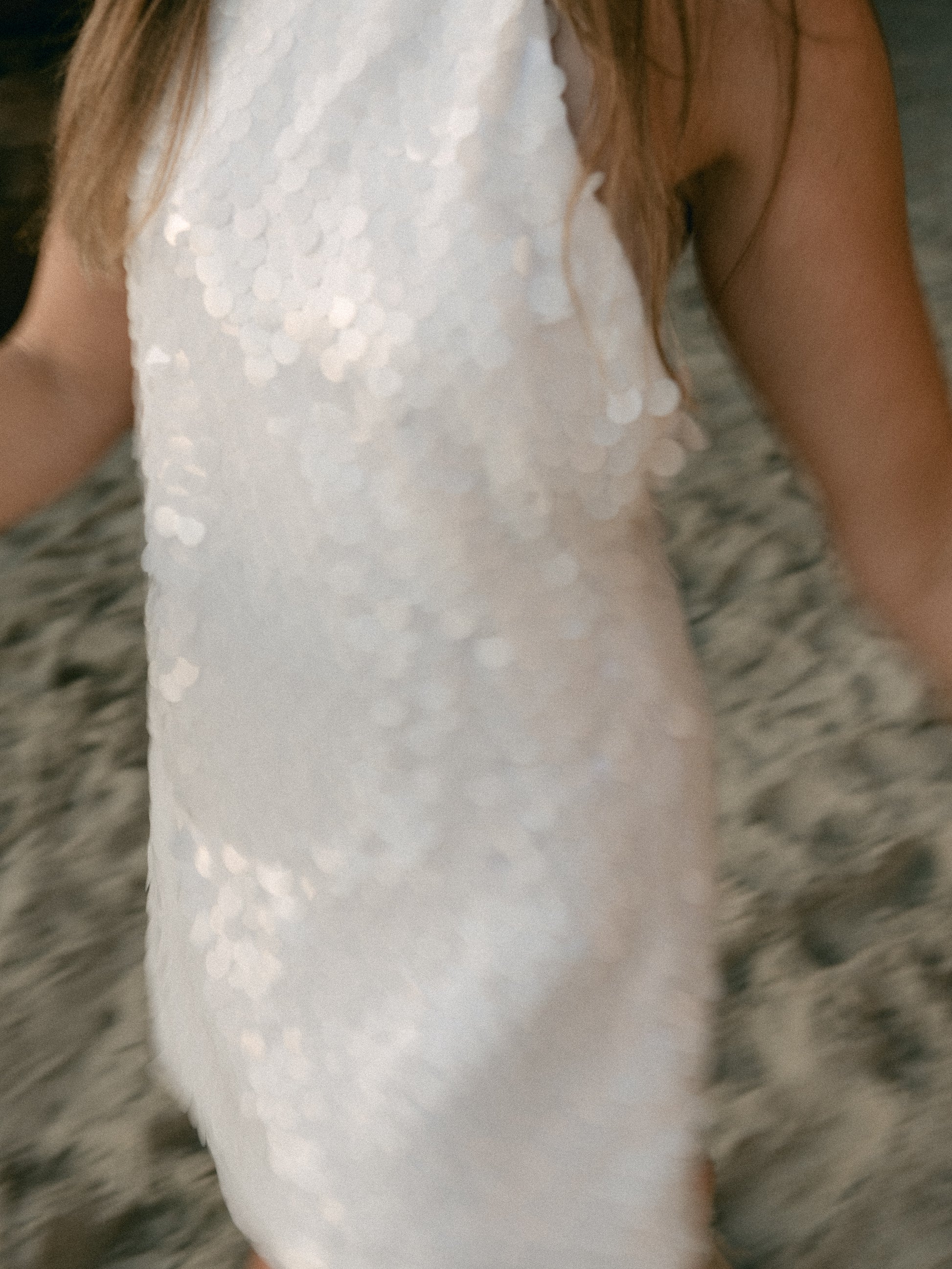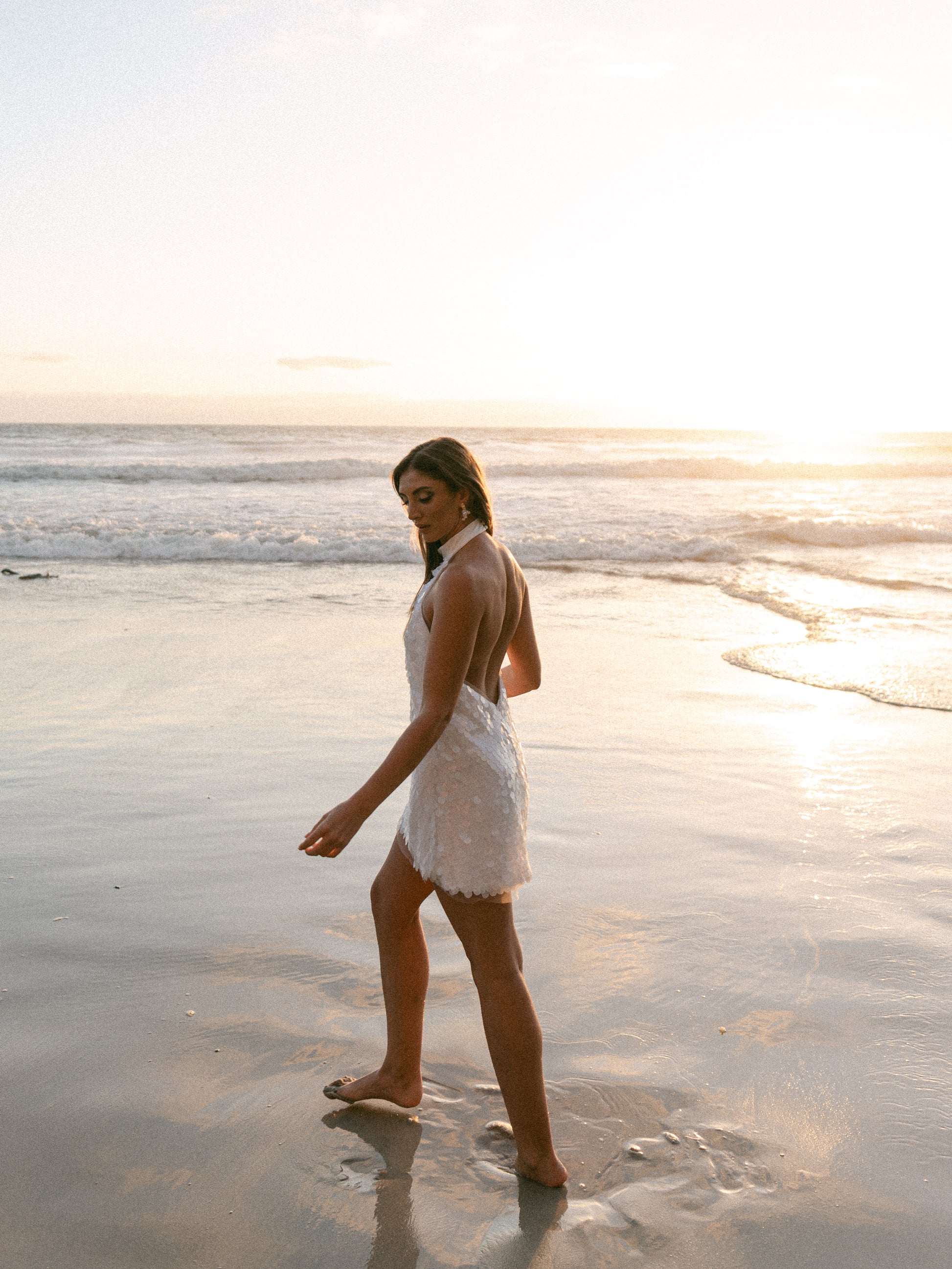 Lyra - ultimate statement for the modern party bride—bold, luminous, and effortlessly chic. Designed with oversized sequins that catch every flicker of light, this halter neck mini dress exudes celestial glamour. A delicate tulle trim softens the shimmer, adding a touch of ethereal romance to its daring silhouette. Made for the bride who isn’t afraid to dance the night away, Lyra is the perfect fusion of modern elegance and goddess-like radiance.
