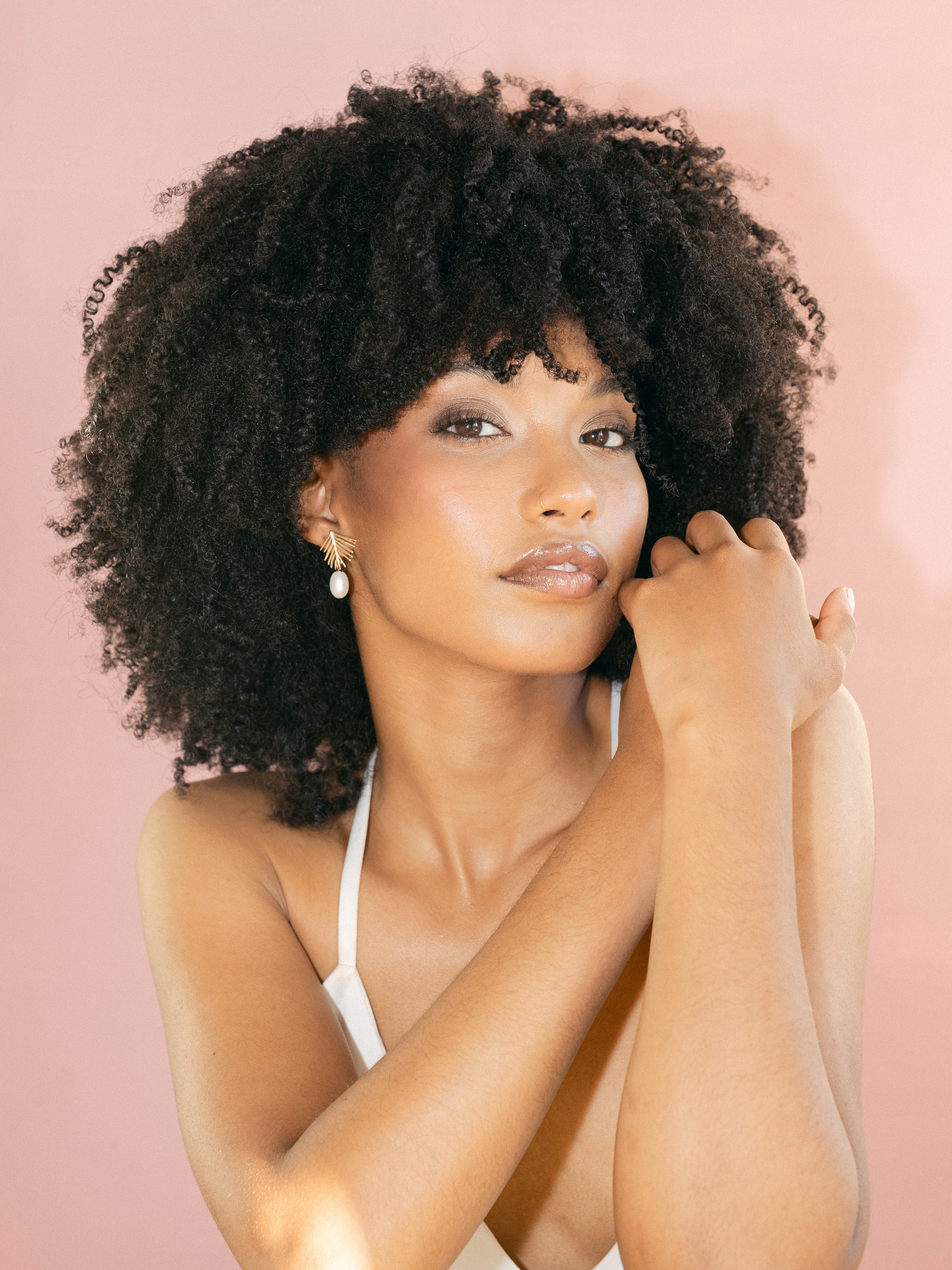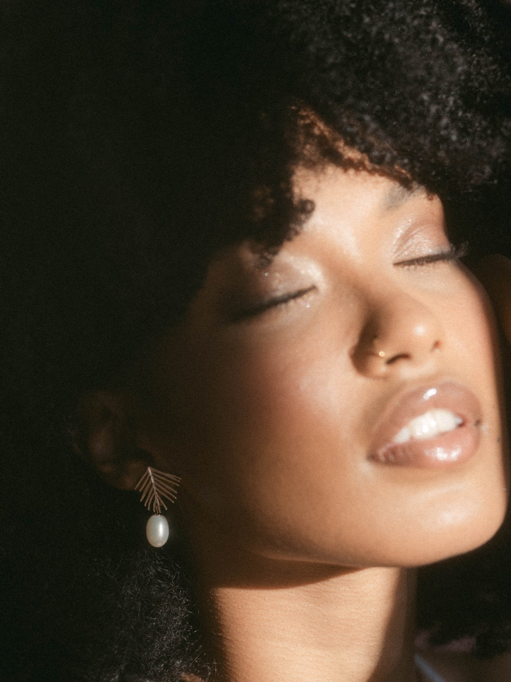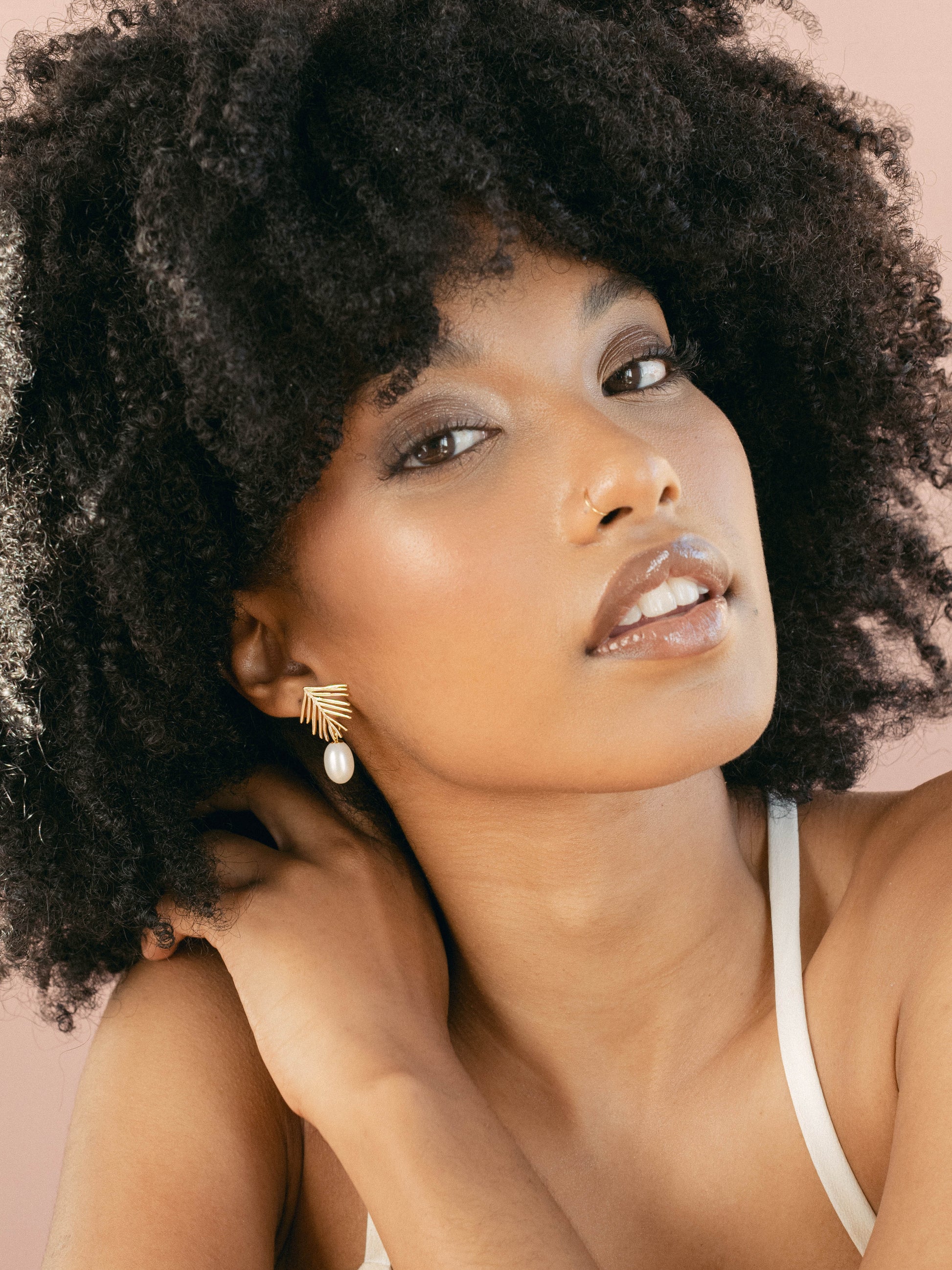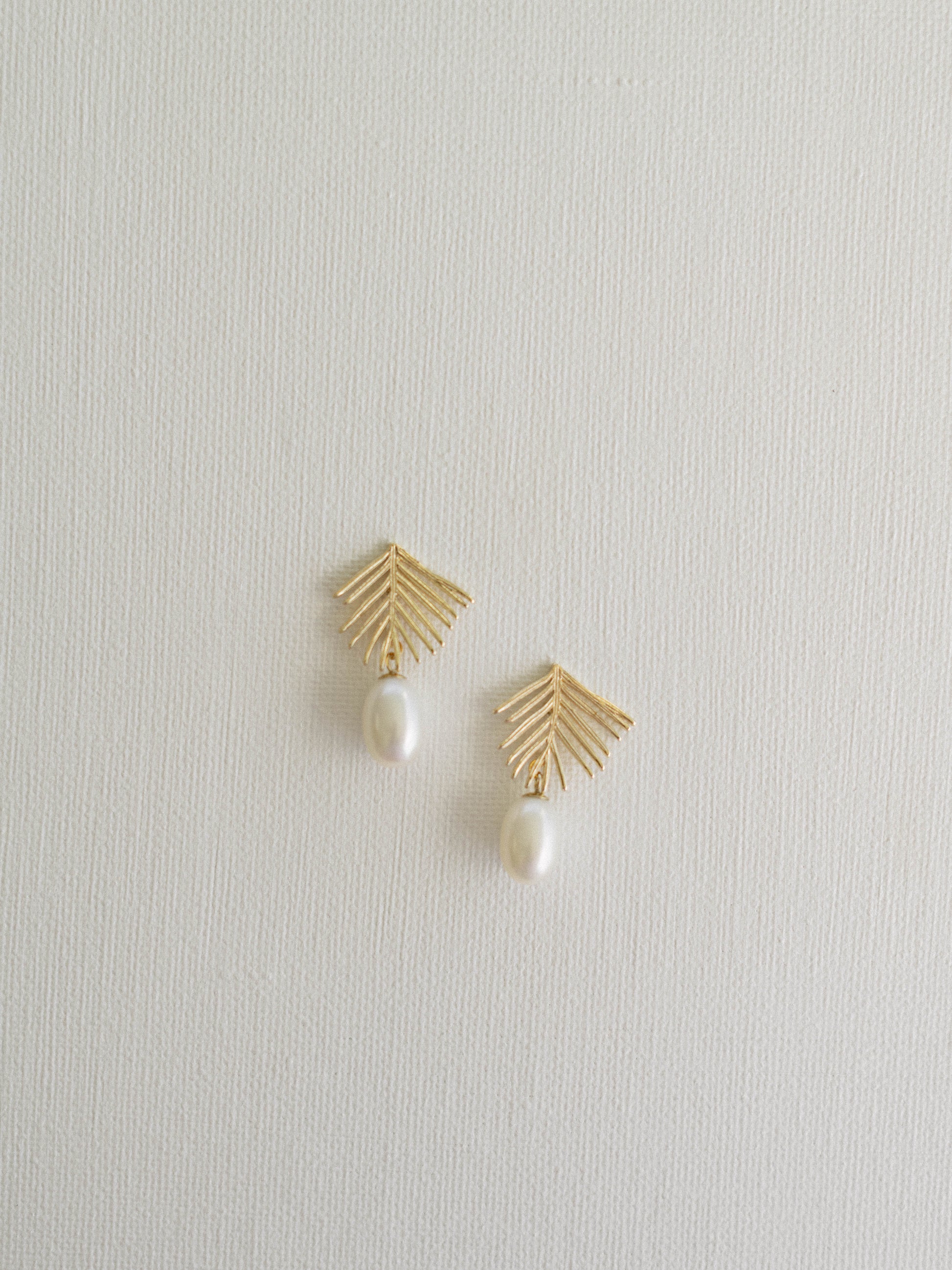 Palma evokes tropical elegance with her refined gold-plated palm frond design, delicately accented by a single freshwater pearl drop. She exudes effortless charm, making her the perfect choice for the bride seeking a modern and unique accessory inspired by nature's beauty.