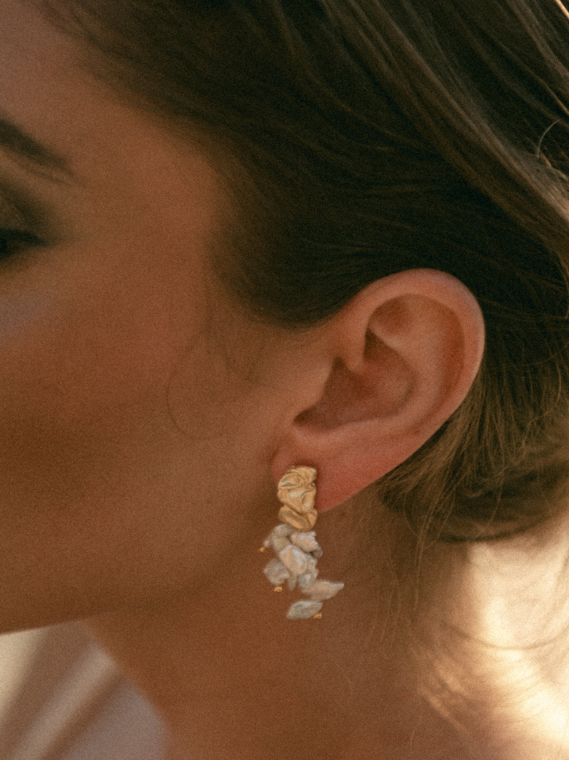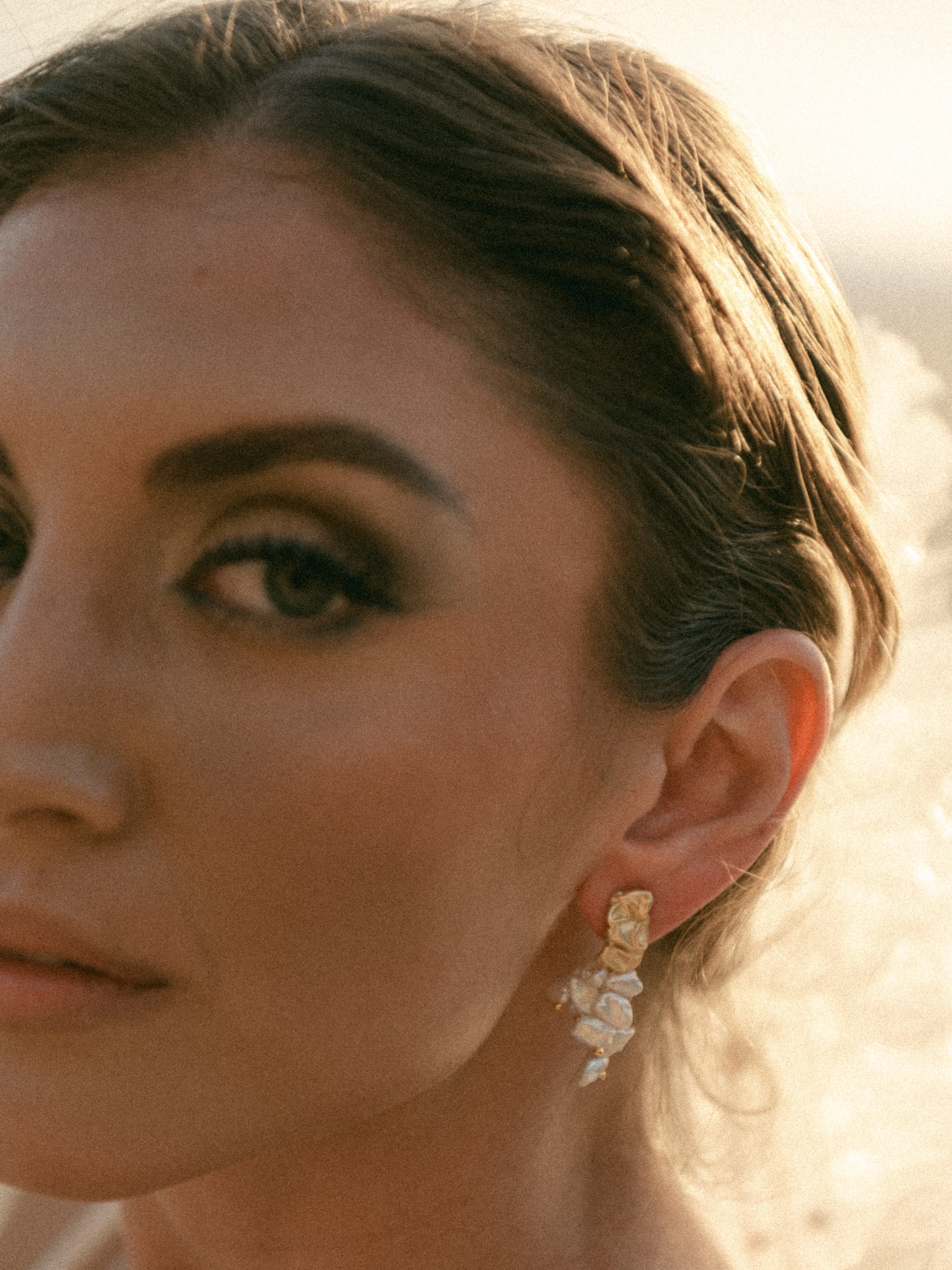 Pearl Reverie is a dreamlike cascade of irregular freshwater pearls suspended from sculpted gold-plated studs. This bold and artistic design captures the essence of modern romance, perfect for the bride who dares to embrace her individuality. With its organic flow and luminous charm, Pearl Reverie adds a touch of ethereal beauty to your bridal look.