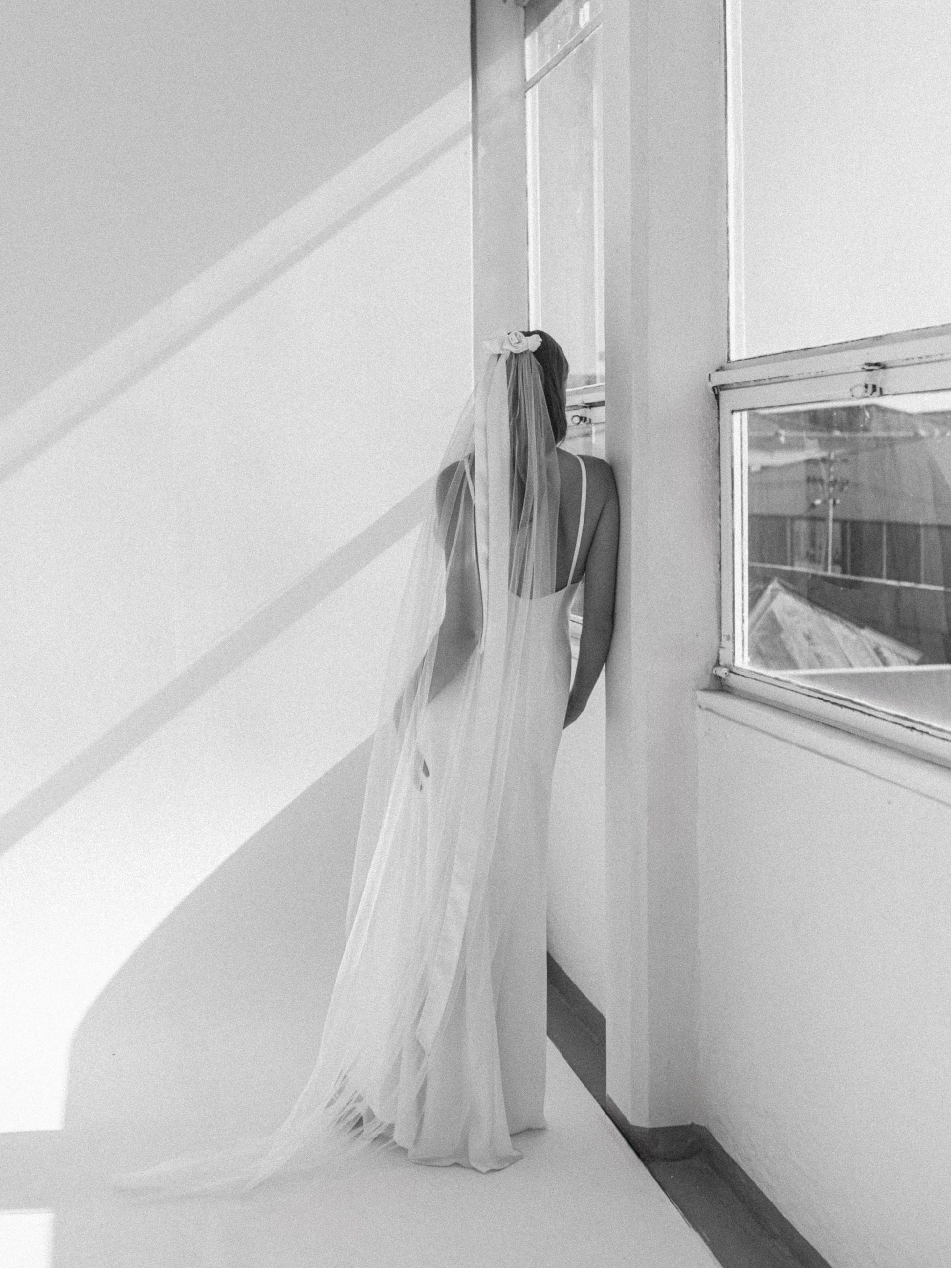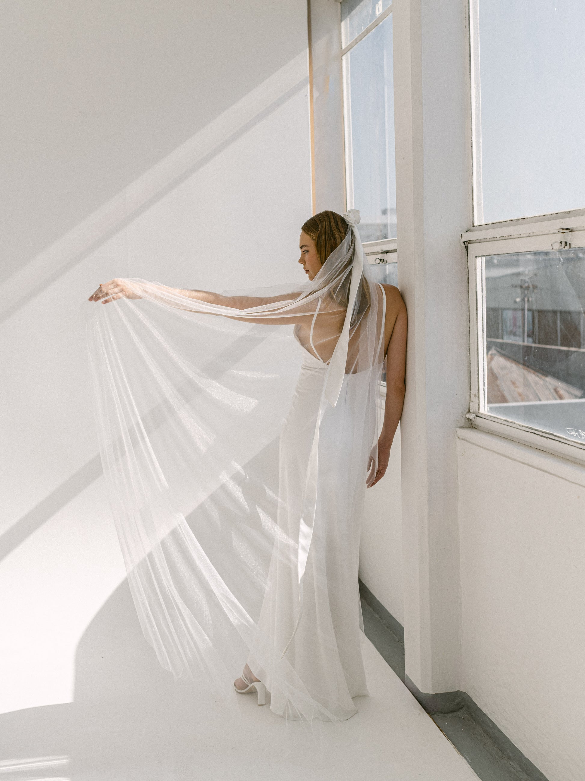 The Rosa Veil features soft shimmer tulle and satin roses for a delicate, romantic touch. Its light, airy design makes it perfect for both the romantic and iconic bride. This veil adds a refined yet natural elegance to any bridal look.