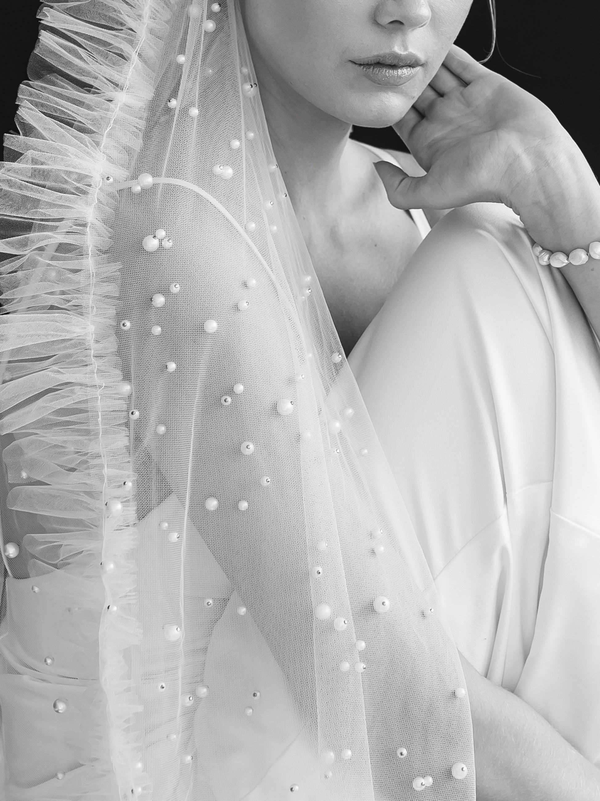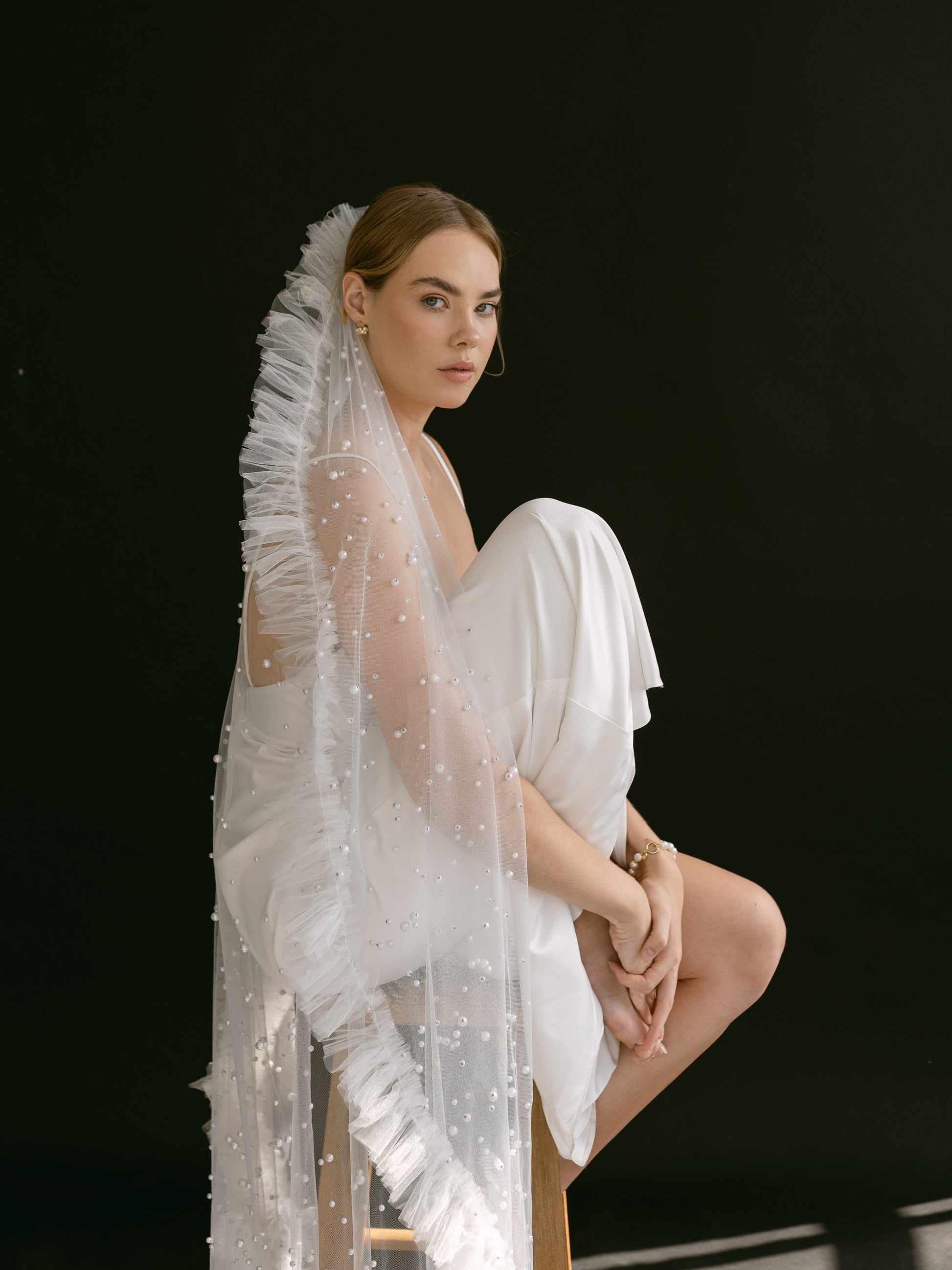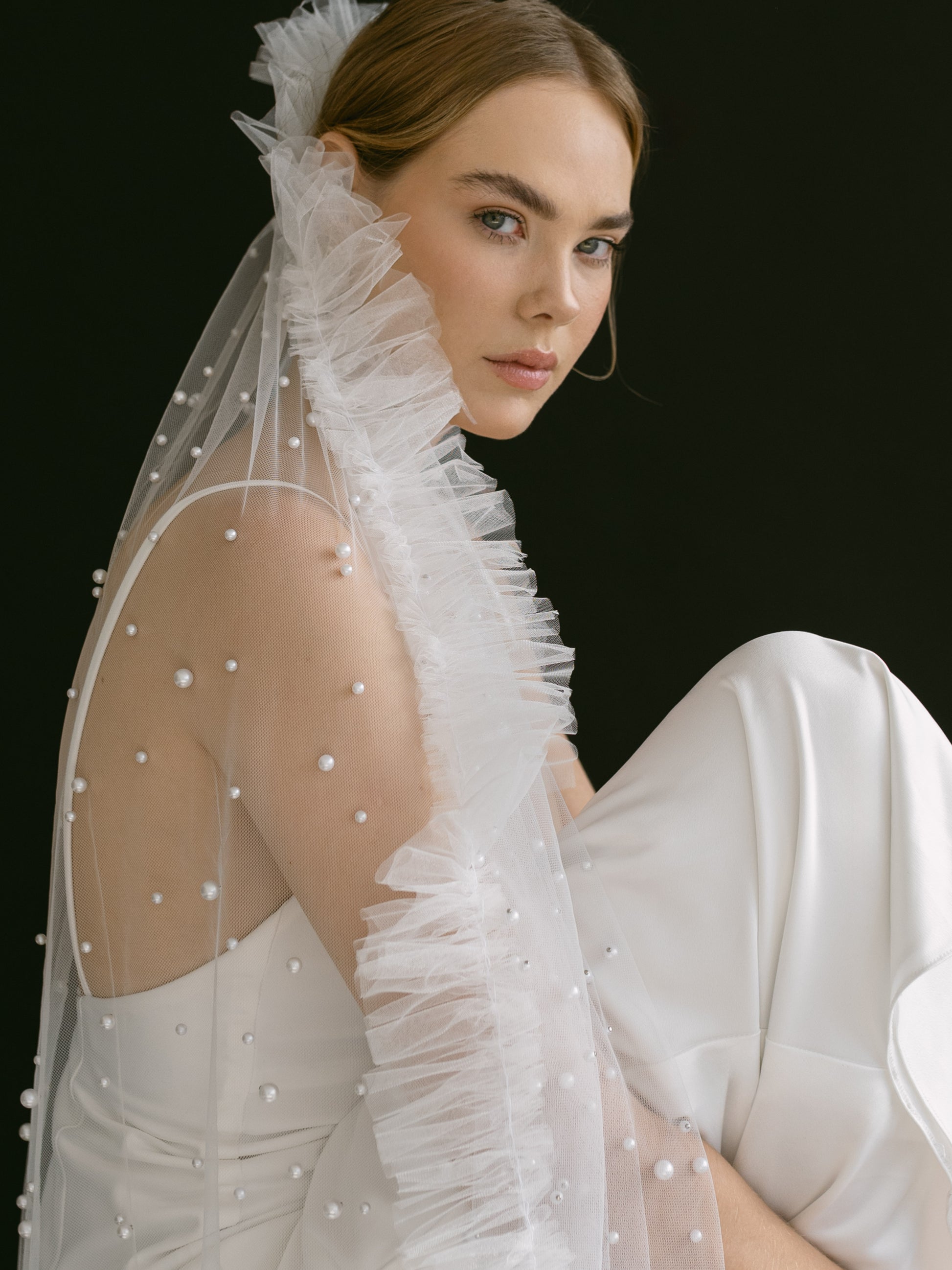 Venus... Adorned with a scattering of pearls on sheer tulle, and finished with delicate trim. This veil enhances any bridal gown, adding a touch of mystique and elegance.