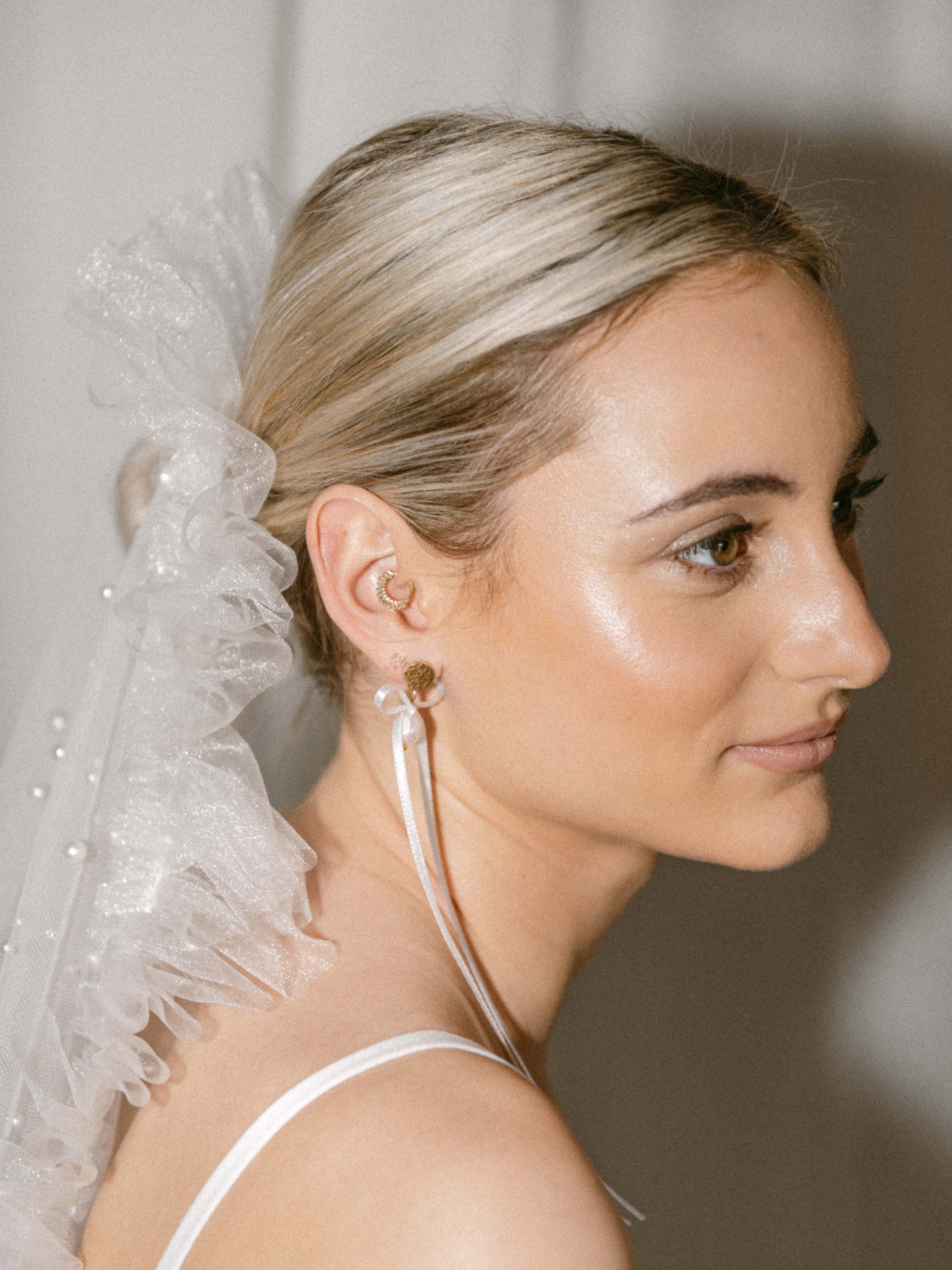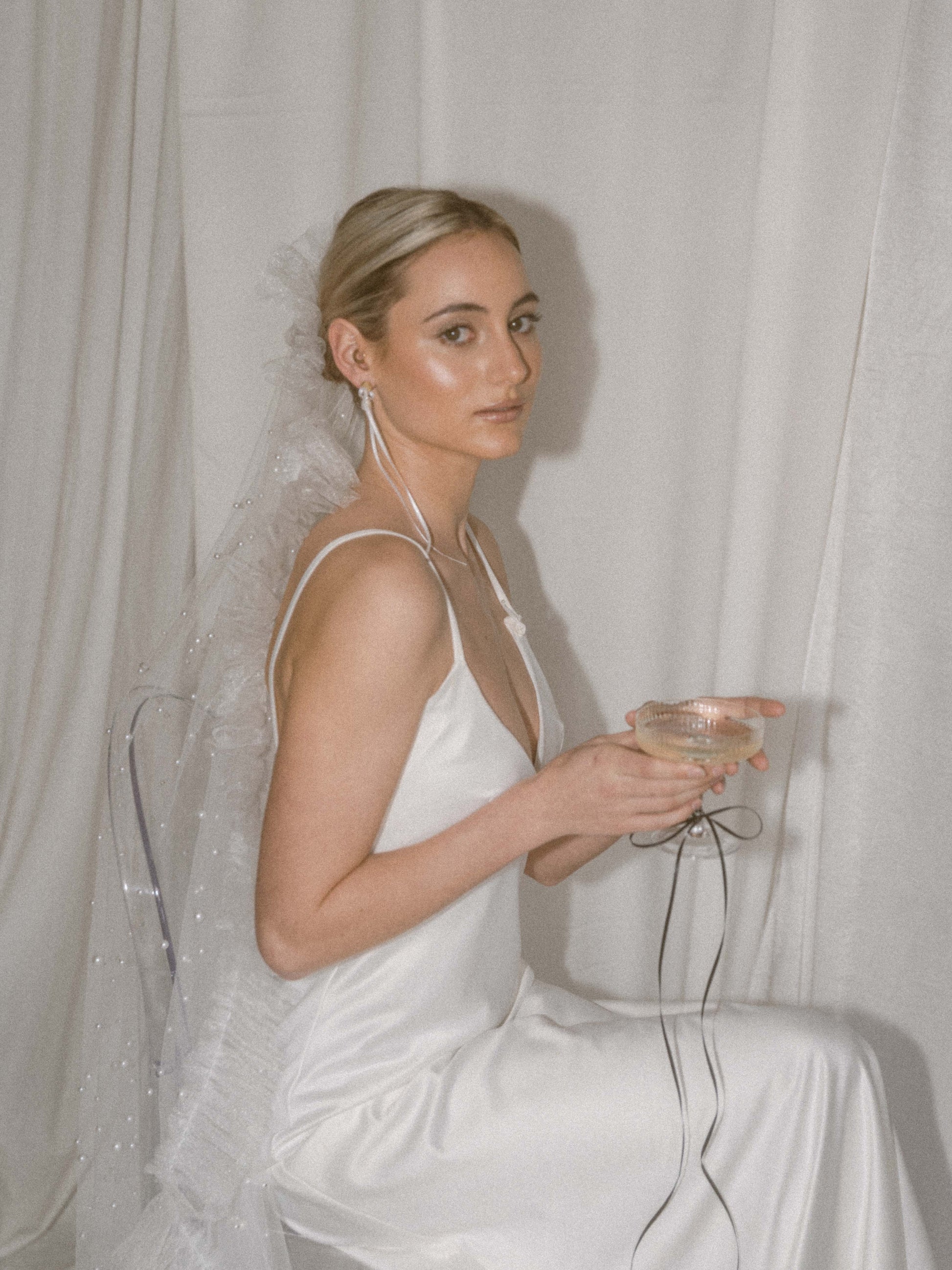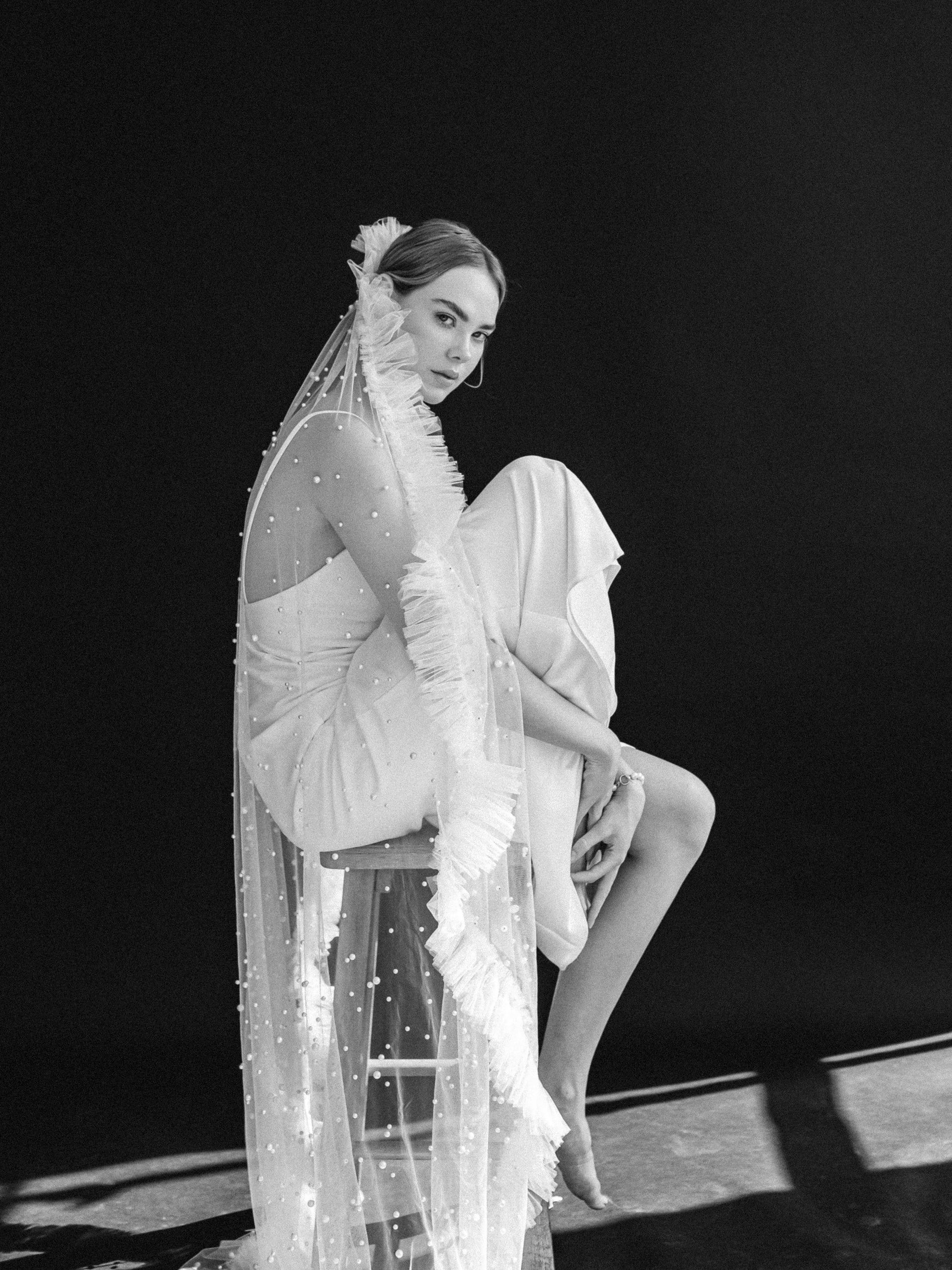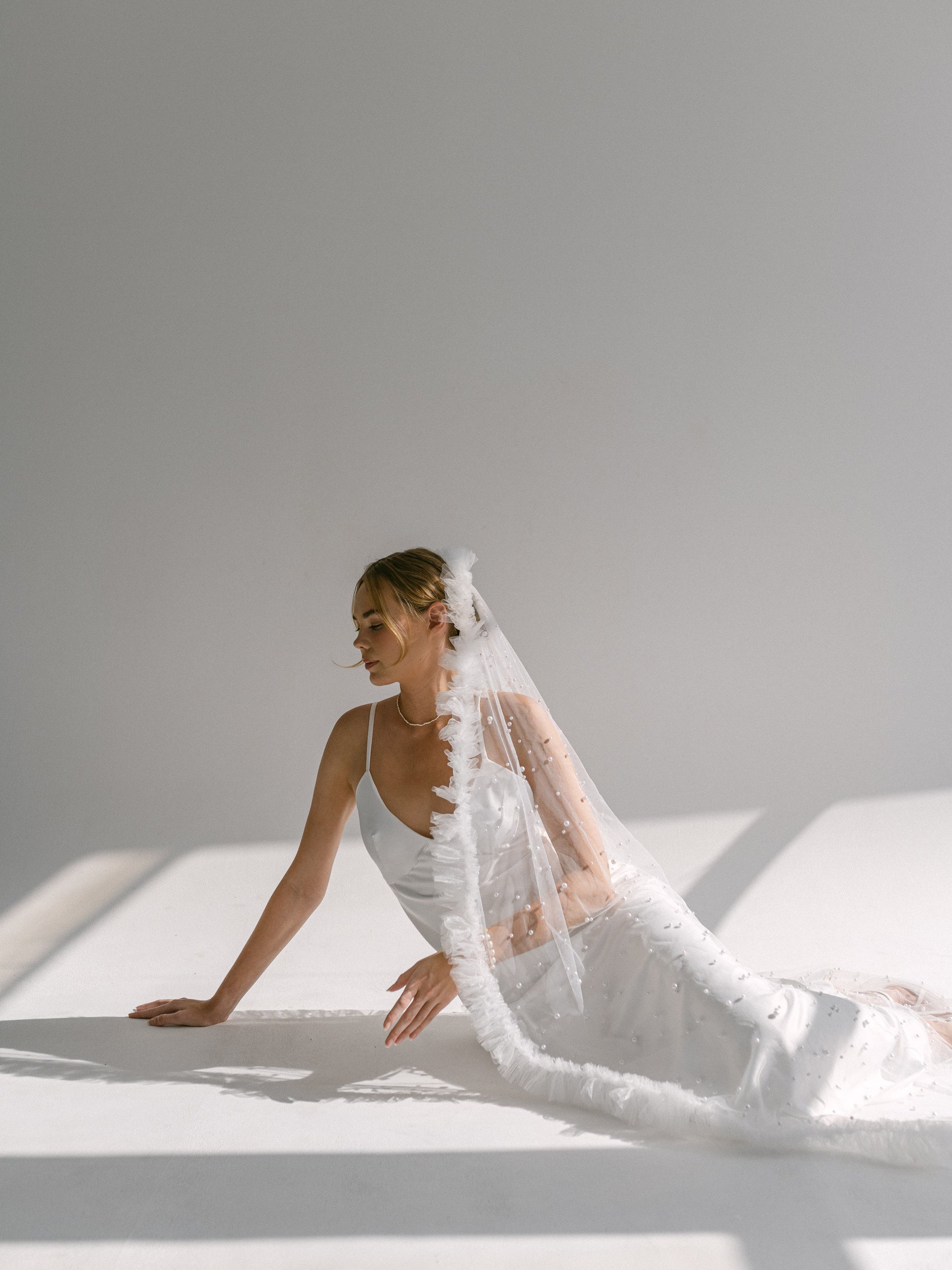 Venus... Adorned with a scattering of pearls on sheer tulle, and finished with delicate trim. This veil enhances any bridal gown, adding a touch of mystique and elegance.