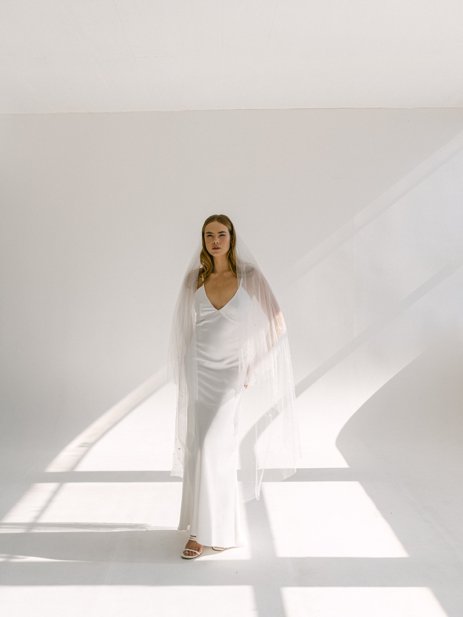 The Shell Veil features hand-beaded shell beads and faux pearls on soft tulle, infusing your bridal look with coastal elegance. Perfect for adding a unique, whimsical touch to your wedding attire.