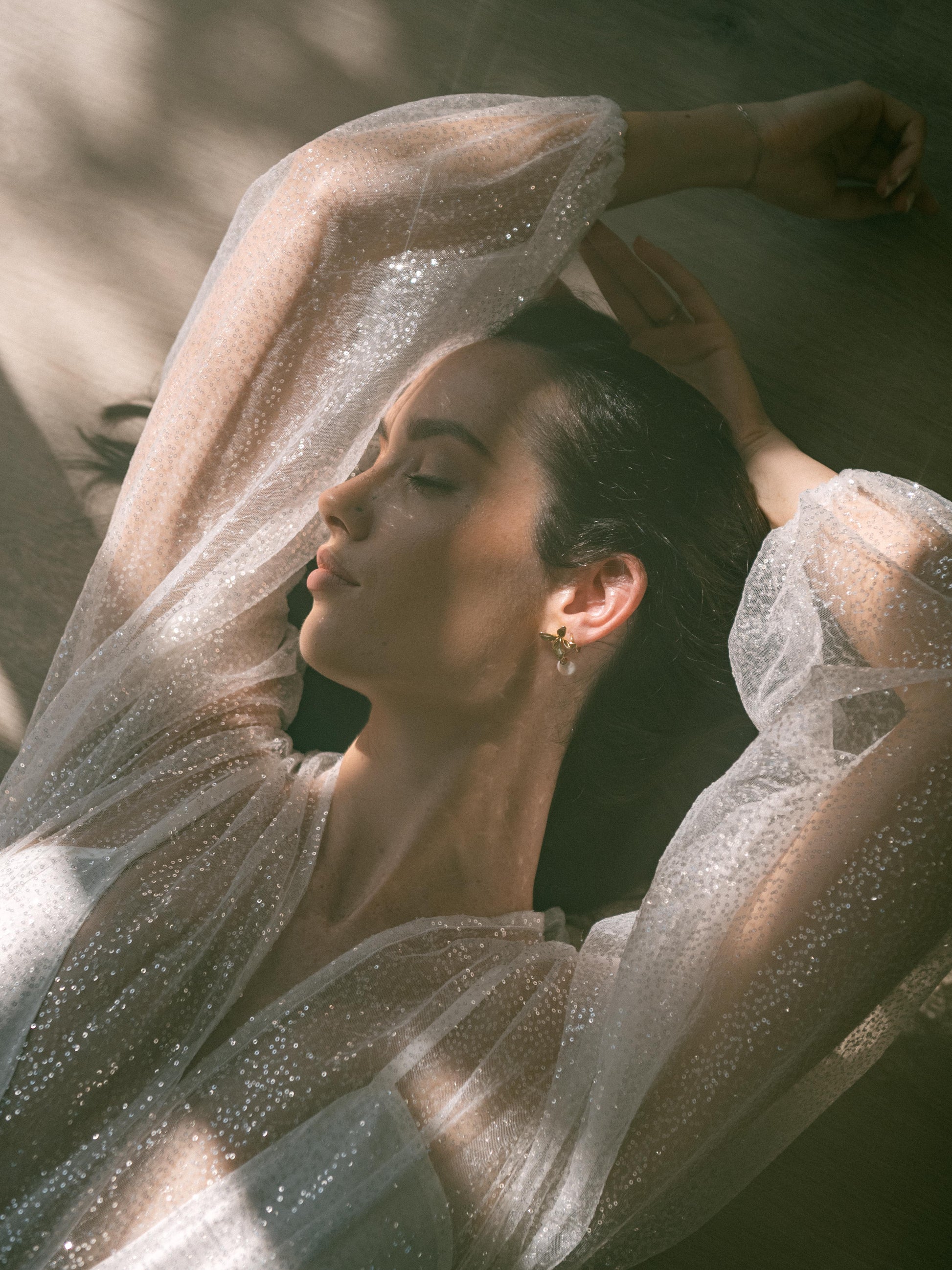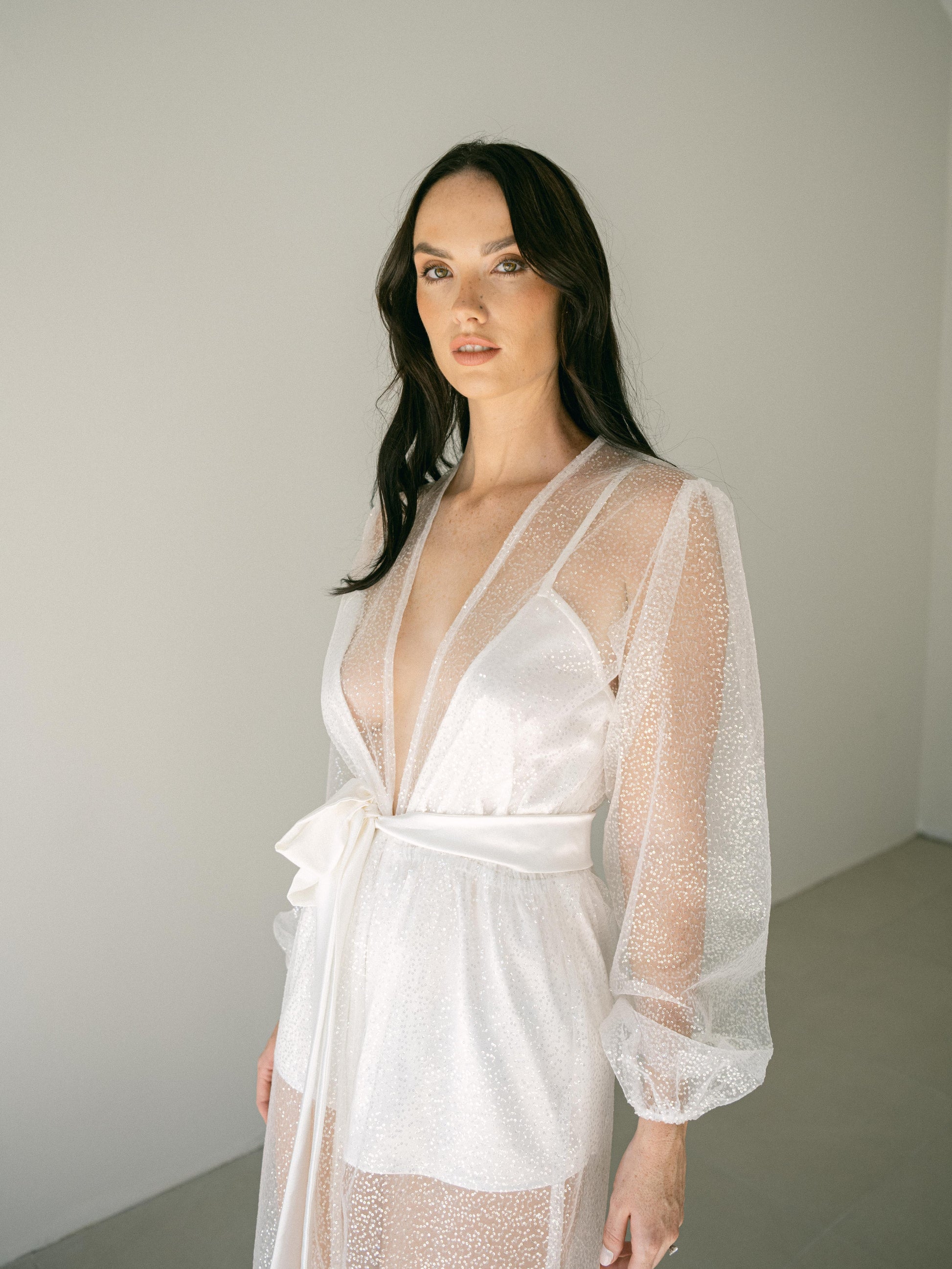 Designed for the bride who wants to shine from the very start, the Celestial Long Robe is a glamorous getting-ready gown made from glistening sequin tulle. With voluminous sheer sleeves, a flowing silhouette, and a wide satin tie, it brings bold elegance to those pre-ceremony moments.