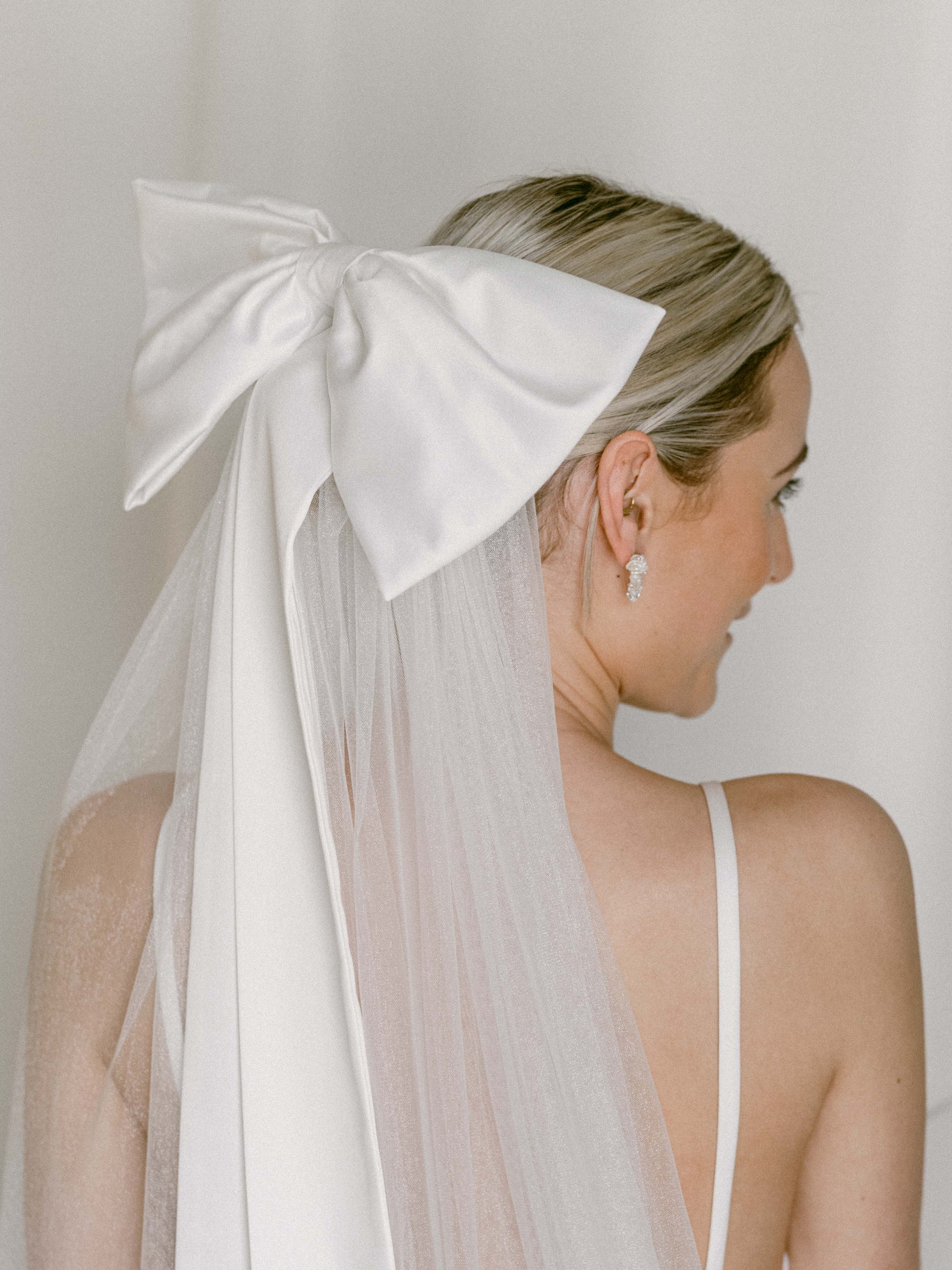 Unveil elegance in layers of satin and tulle. Our statement bow veil, available in three lengths, is designed for the modern bride who loves a touch of drama. Choose your perfect length and let your bridal style speak volumes.
