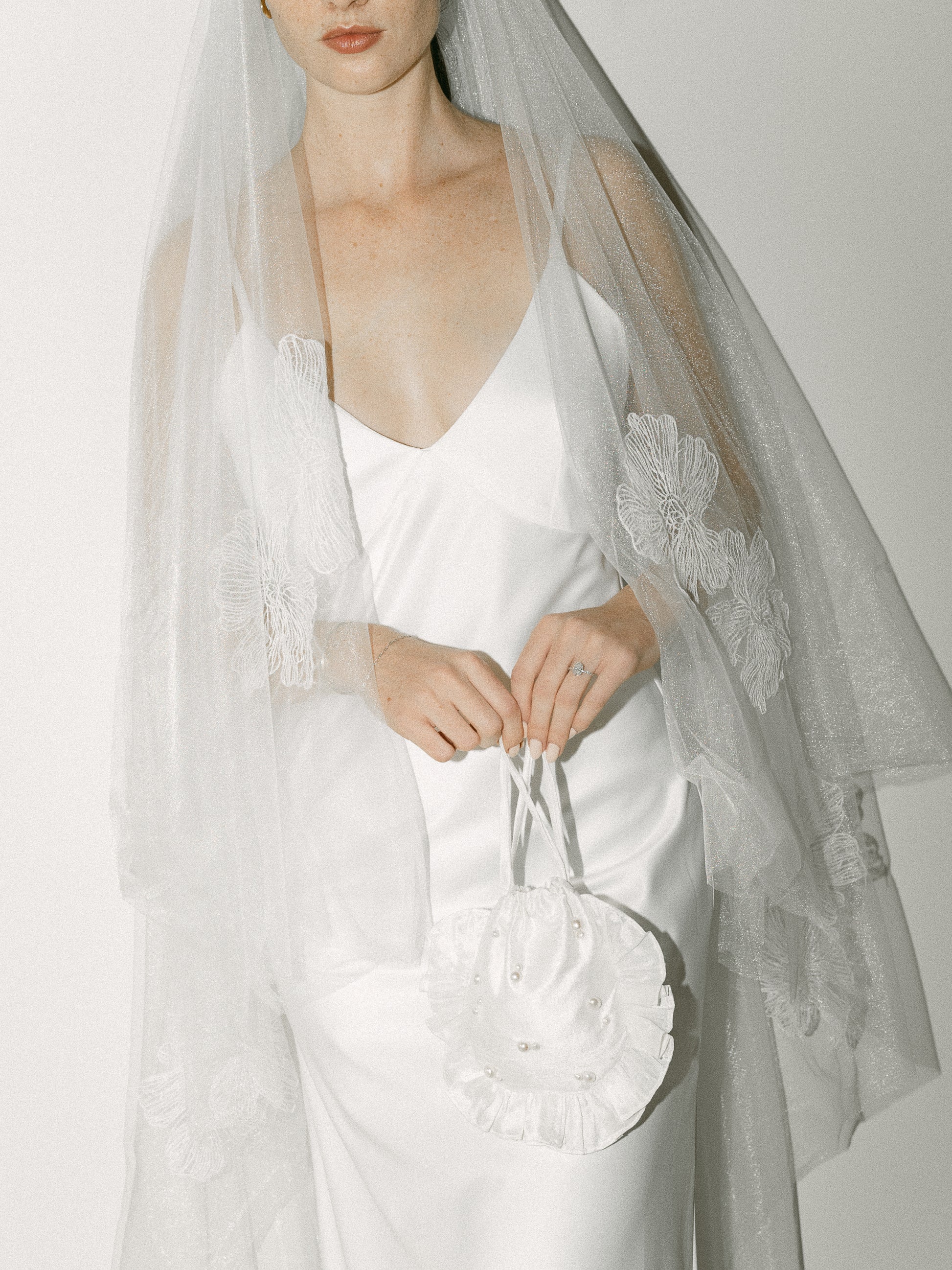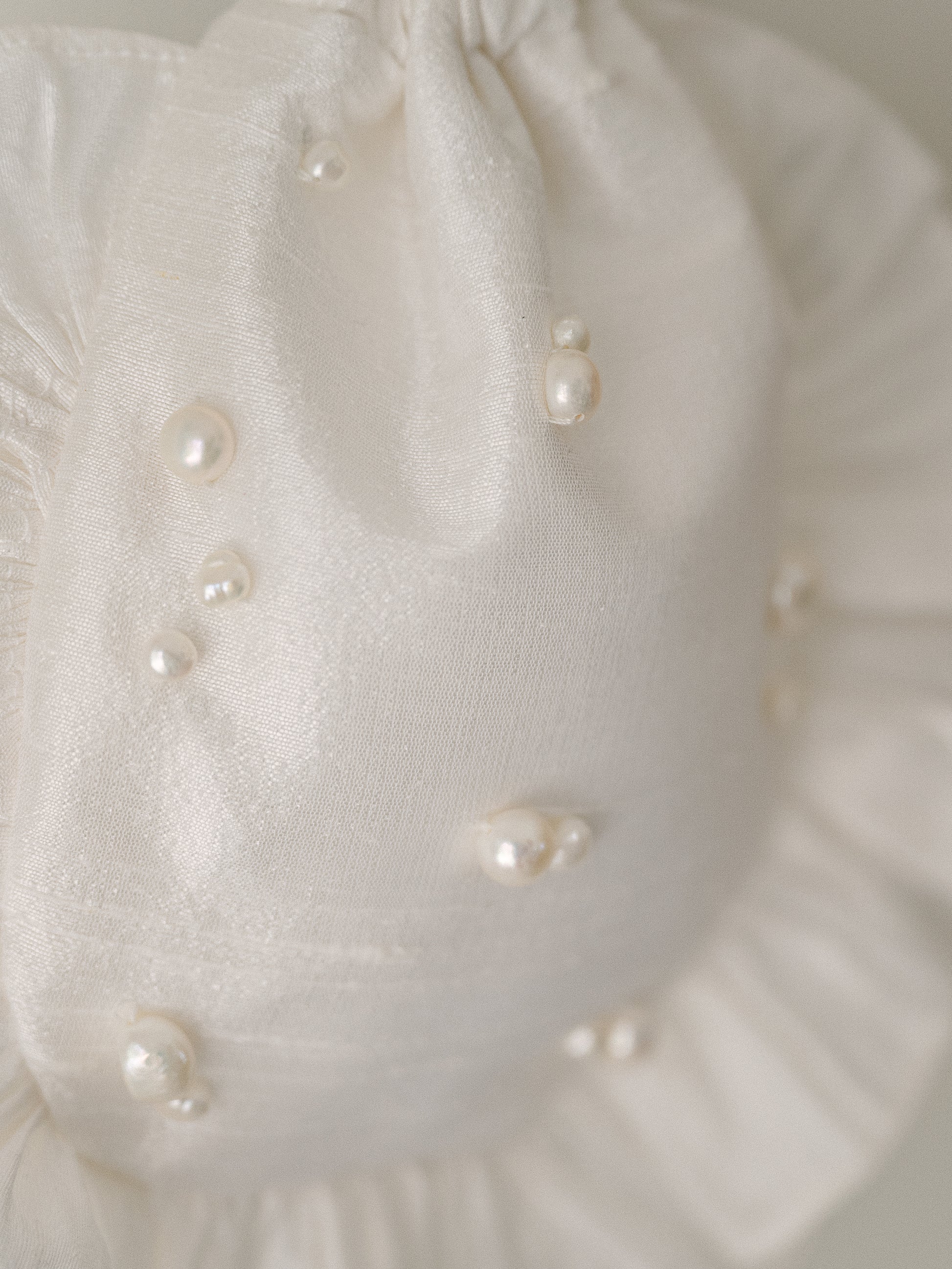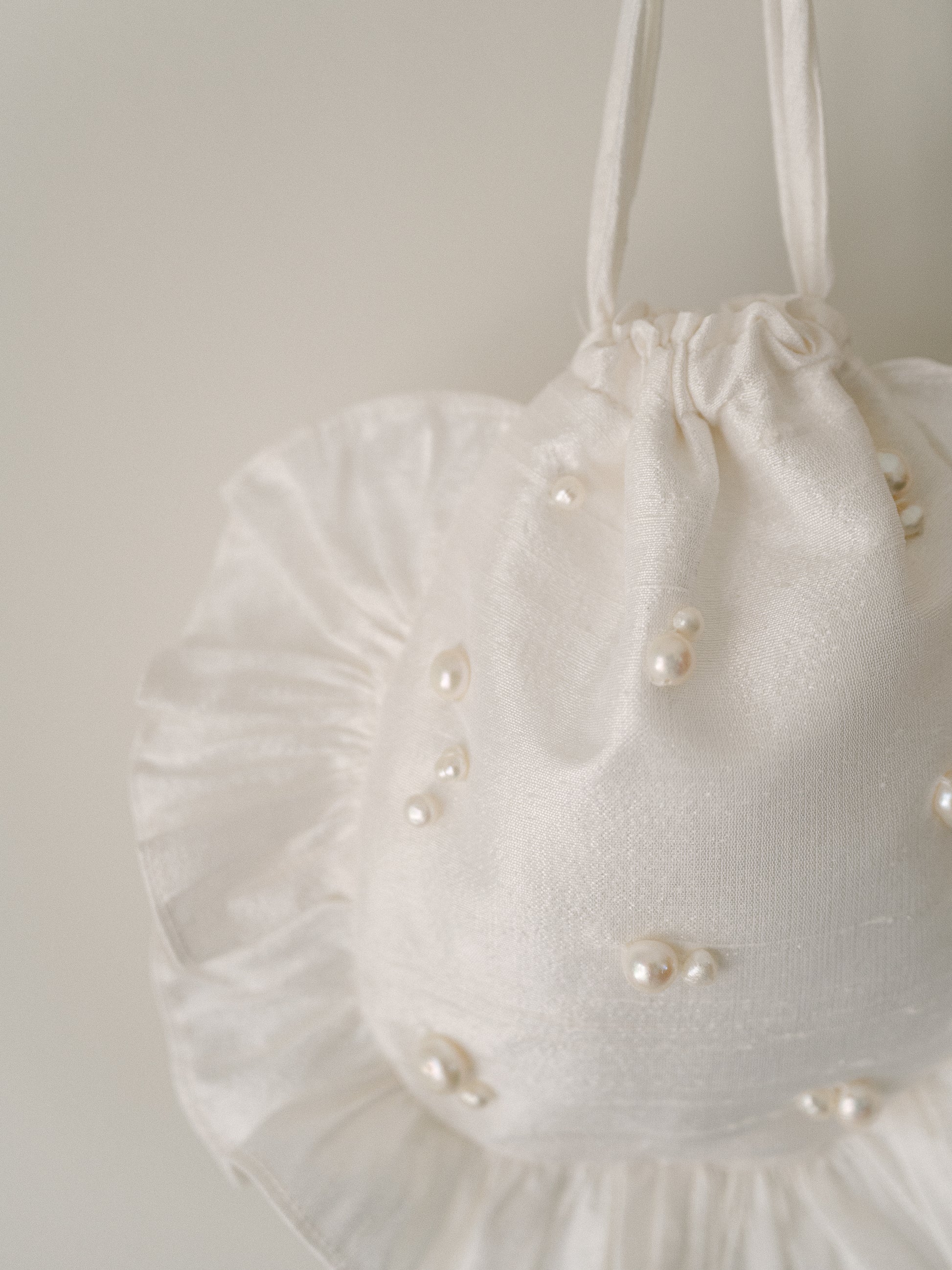 A refined bridal bag with thoughtful detail, the Pearl Ruffle Wristlet is crafted from raw silk and finished with a delicate ruffle edge. Freshwater pearl accents add subtle texture and timeless elegance.