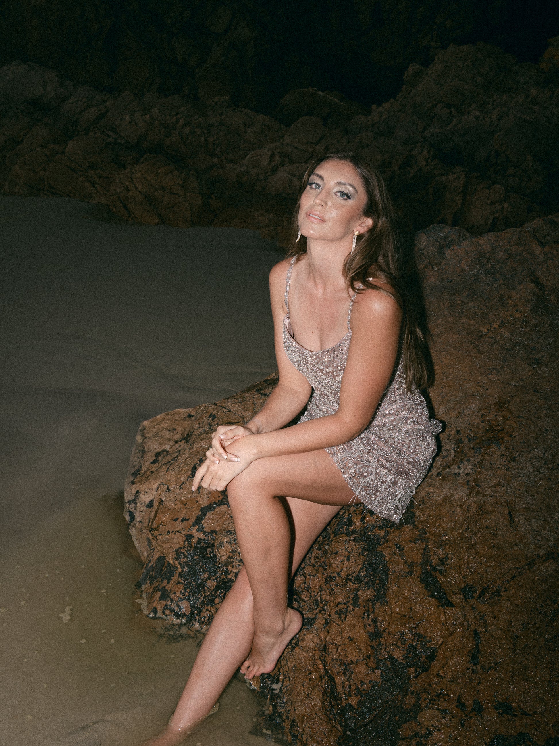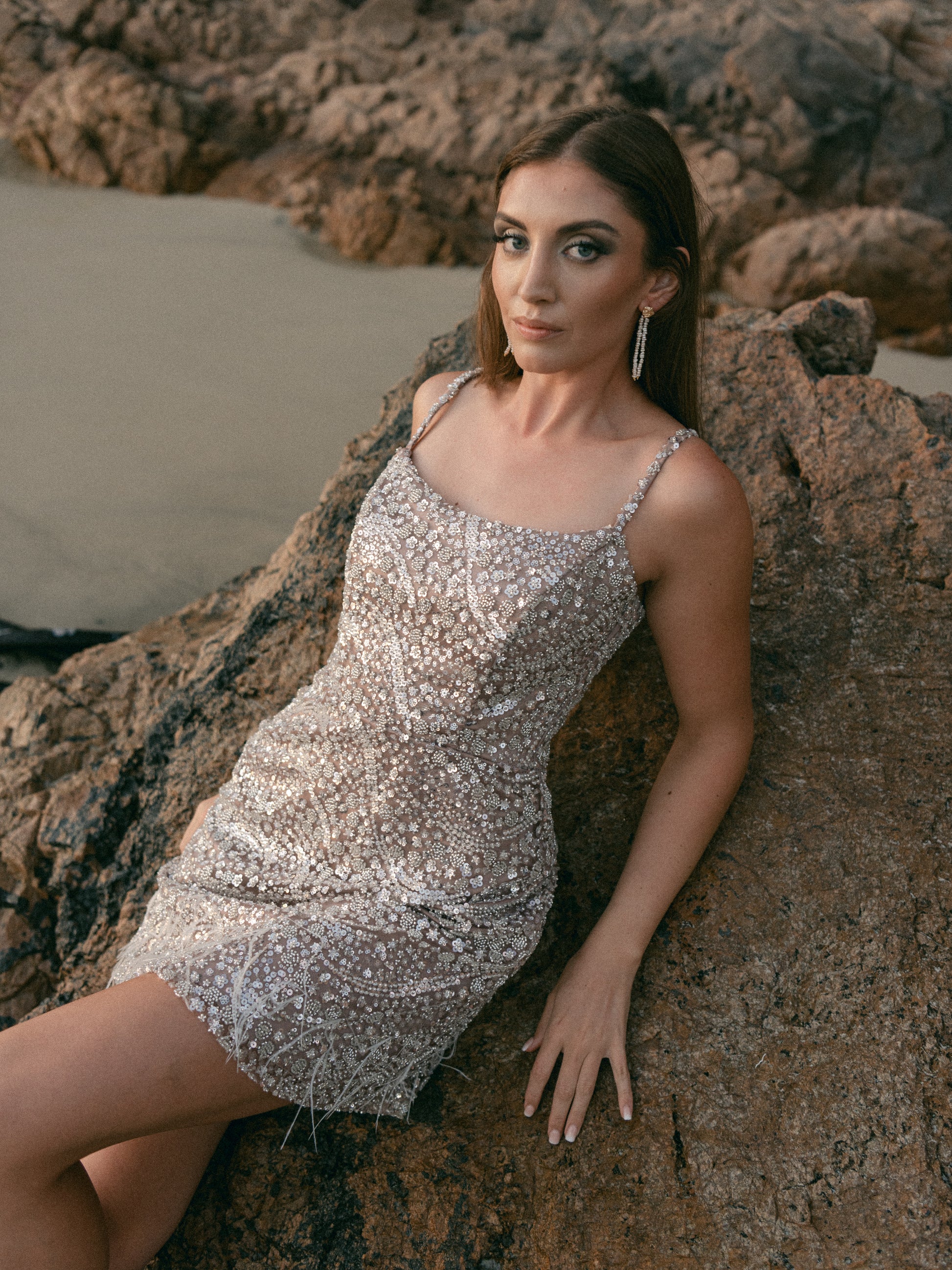 Vega is a celestial dream, designed for the bride who was born to shine. This sparkly A-line mini dress shimmers with intricate silver beading, cascading like stardust over a soft taupe satin base. Delicate feather trims add a touch of ethereal movement, making every step feel weightless and glamorous. A perfect balance of playful charm and modern edge, Vega is made for the bride who owns the night with confidence, elegance, and effortless radiance.