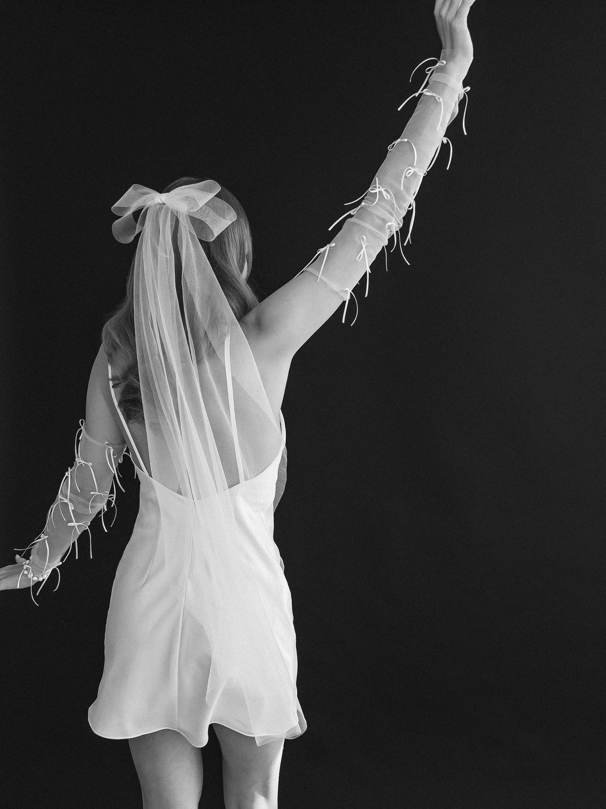 Made from soft tulle and delicate mesh, this bow will add a whimsical touch to your bridal look. The light fabric and subtle textures make it perfect for the bride seeking a blend of elegance and whimsy on her special day.
